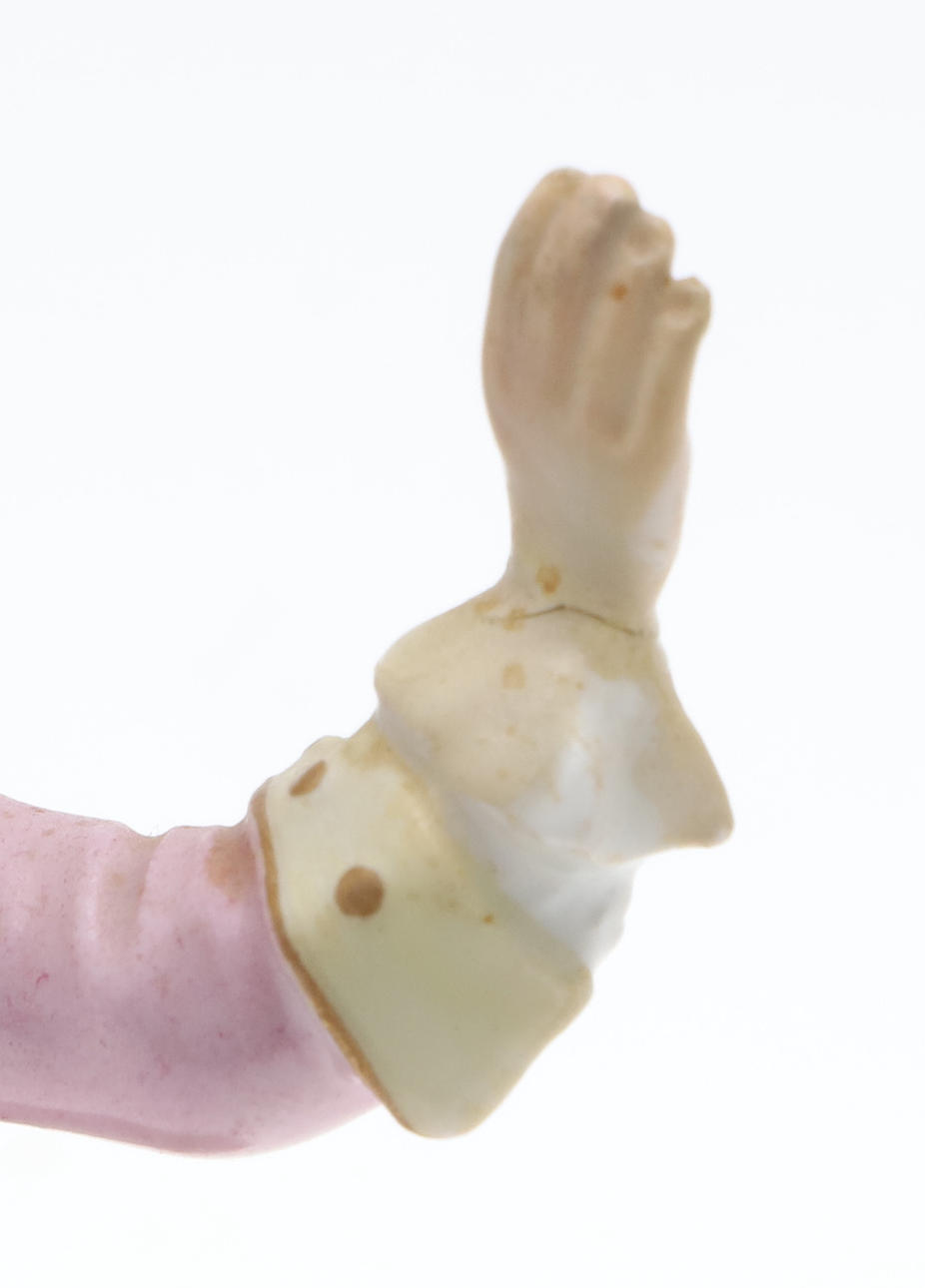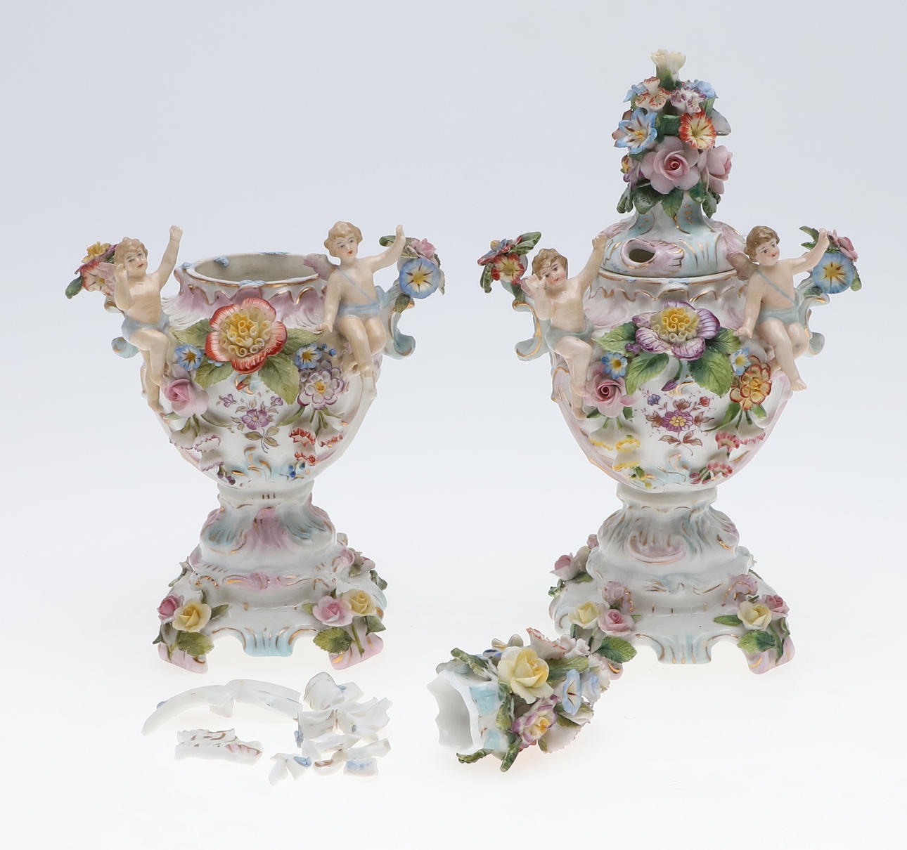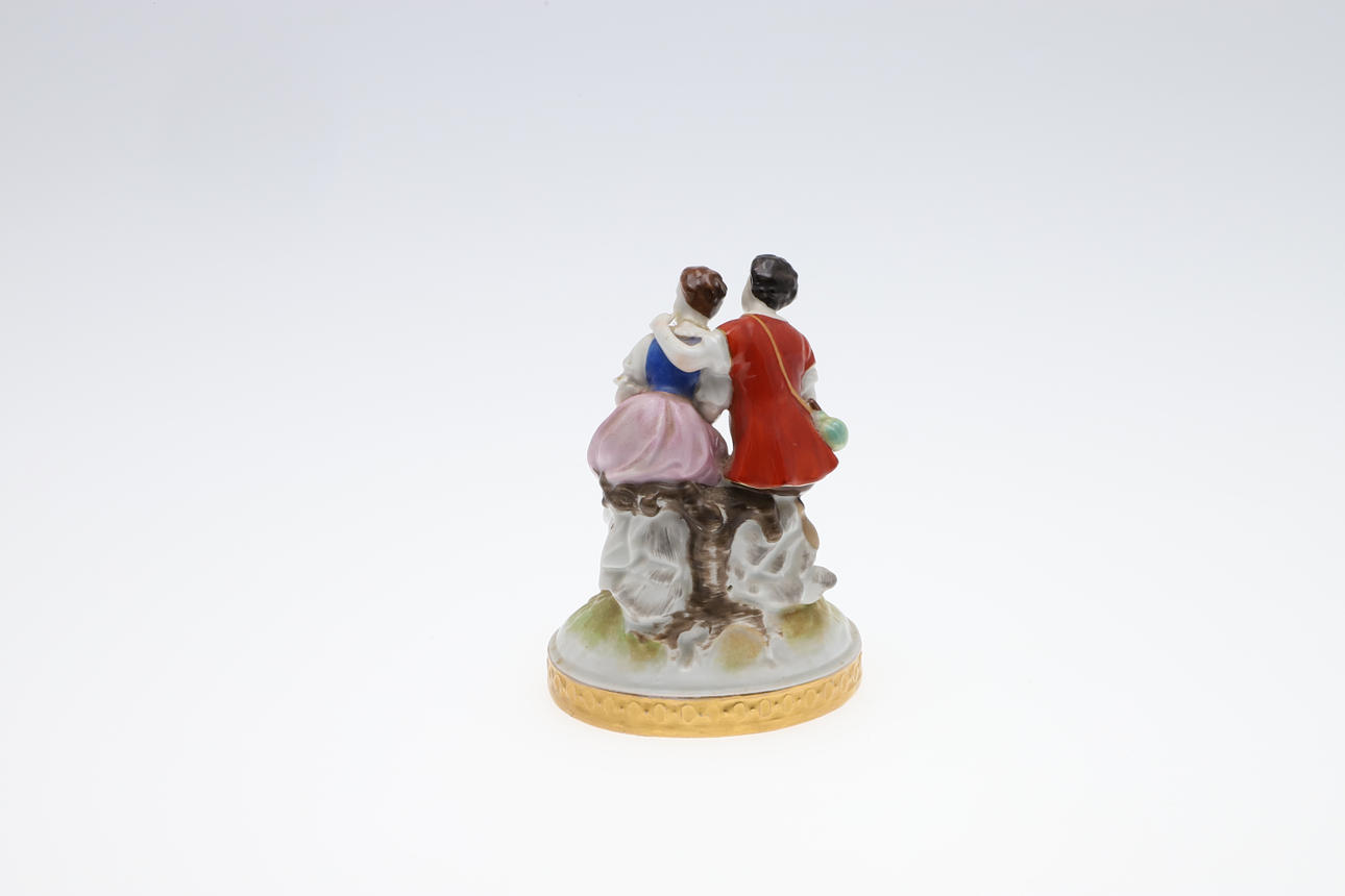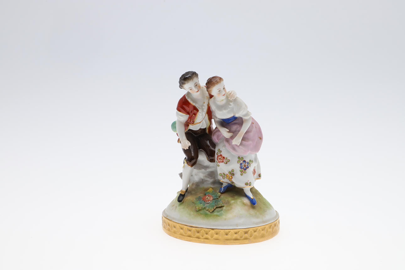 To figurer, herre - brækket ved håndled og restaureret, dame - hat afhugget, mulig restaurering til arm, brækket i taljen og repareret figurgruppe, damehoved brækket og repareret enkeltfigur, hat afhugget, fingre nappet Urner med låg, en urne - låg helt knækket og i stykker, forskellige små napper til blomsterne.