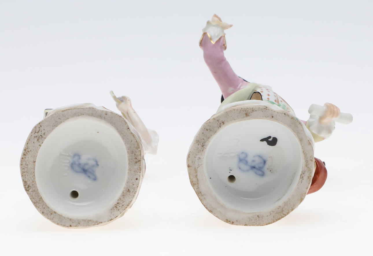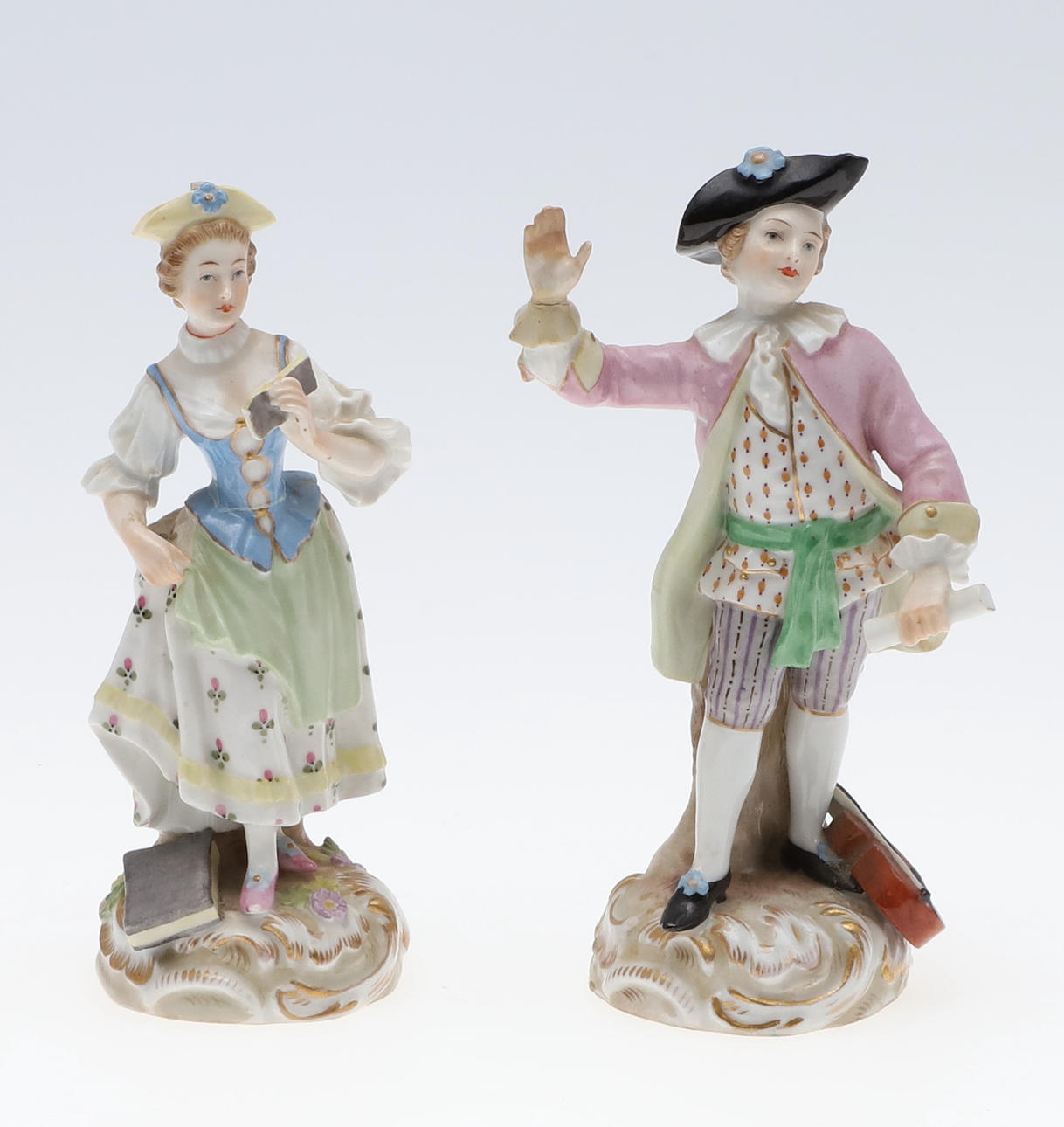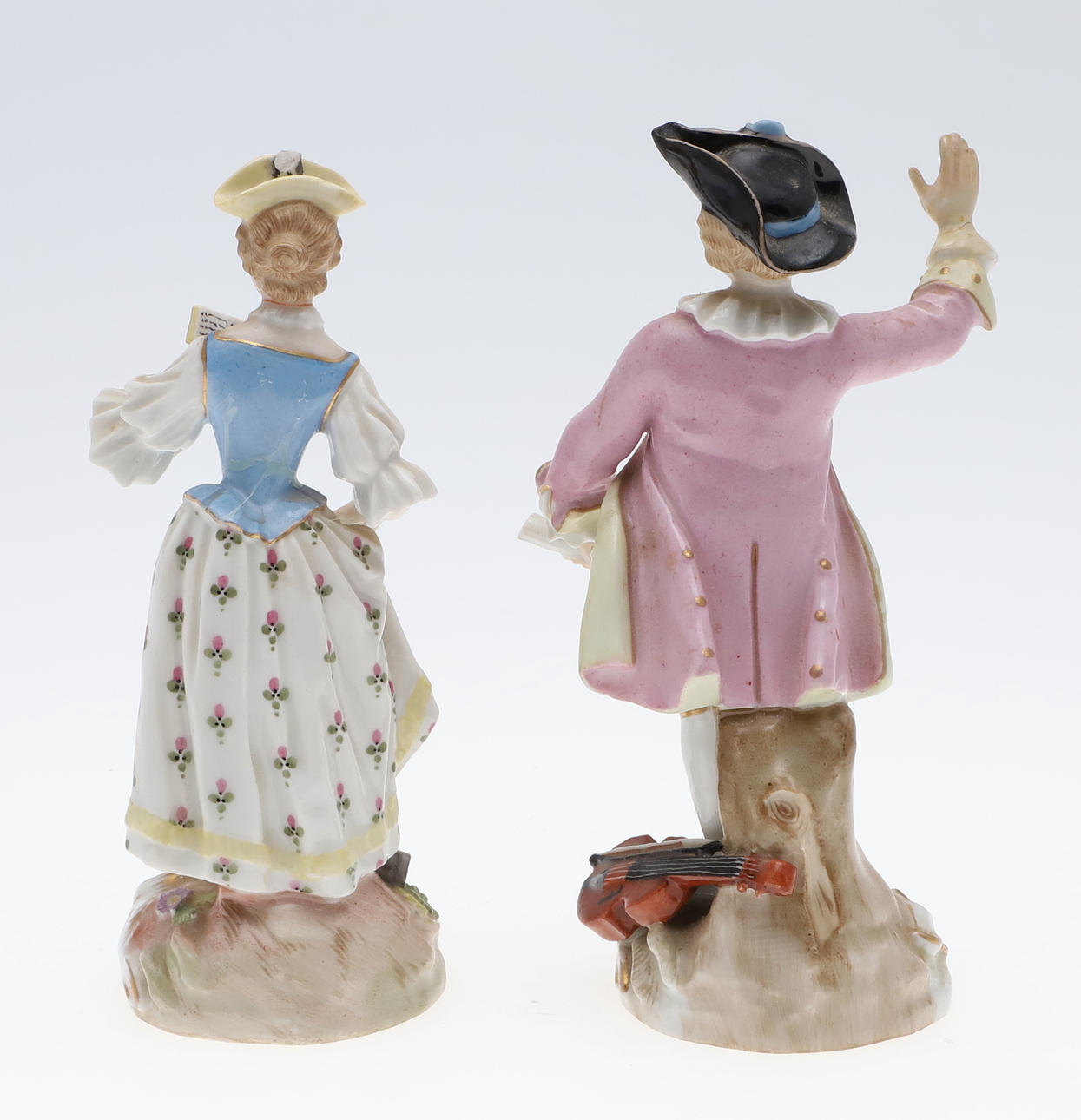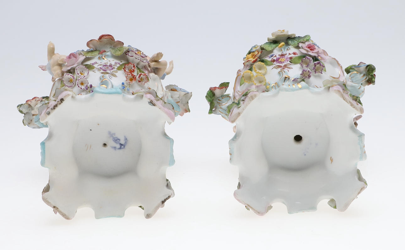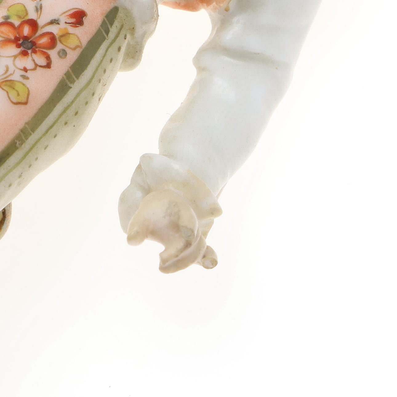 To figurer, herre - brækket ved håndled og restaureret, dame - hat afhugget, mulig restaurering til arm, brækket i taljen og repareret figurgruppe, damehoved brækket og repareret enkeltfigur, hat afhugget, fingre nappet Urner med låg, en urne - låg helt knækket og i stykker, forskellige små napper til blomsterne.