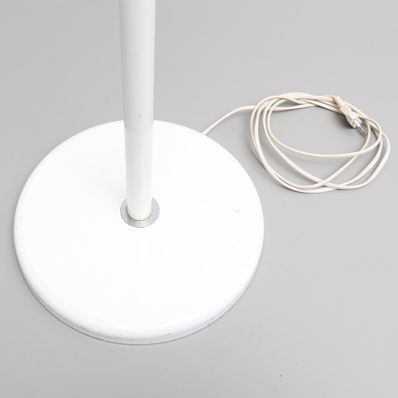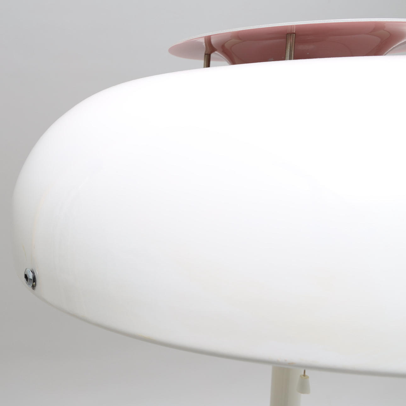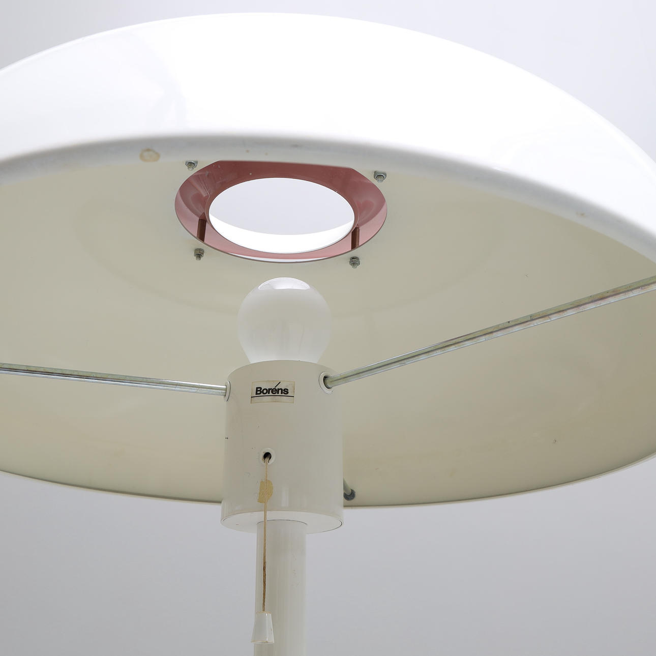 Hvidlakeret metal, den reflekterende del af skærmen har en pink tone.