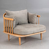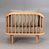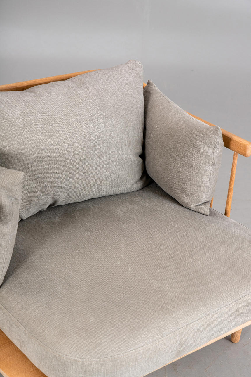 'FLY-SC 1' loungestol fra Space Copenhagen. Stel af olieret eg. Massiv eg og egefiner. Løse polstrede hynder betrukket med gråt stof.