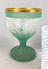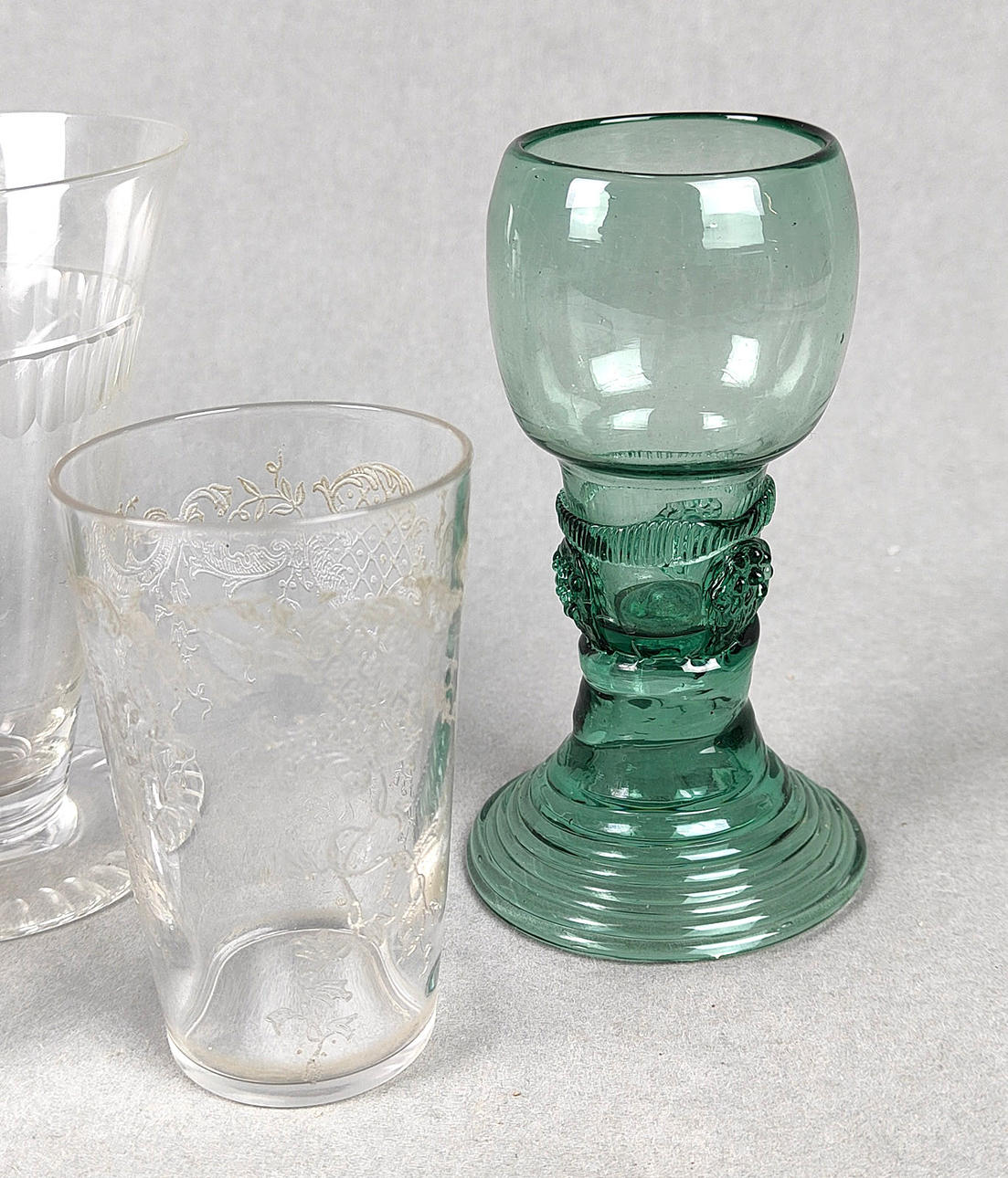 Grønt og farveløst glas, håndblæst, delvist færdigbehandlet, inklusive 2 bægerglas, 3 bægerglas og et likørglas *J. Prunier Cognac*, sat. 6 stk, H ca. 9 til 12 cm, grøn bæger med smeltet dekoration let beskadiget ved trinfoden.