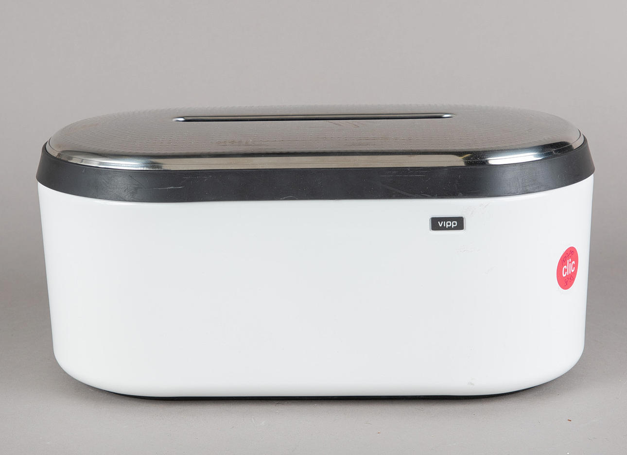 Brødæske 'VIPP270' i hvid fra Vipp. Til opbevaring af brød. Stållåg, vaskbar inderpose i bomuld, gummiring i bunden. Pulverlakeret stål, rustfrit stål, bomuld.
