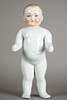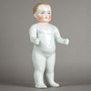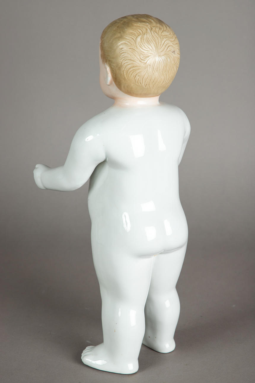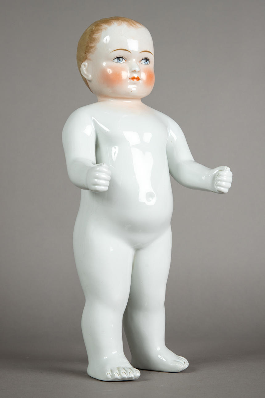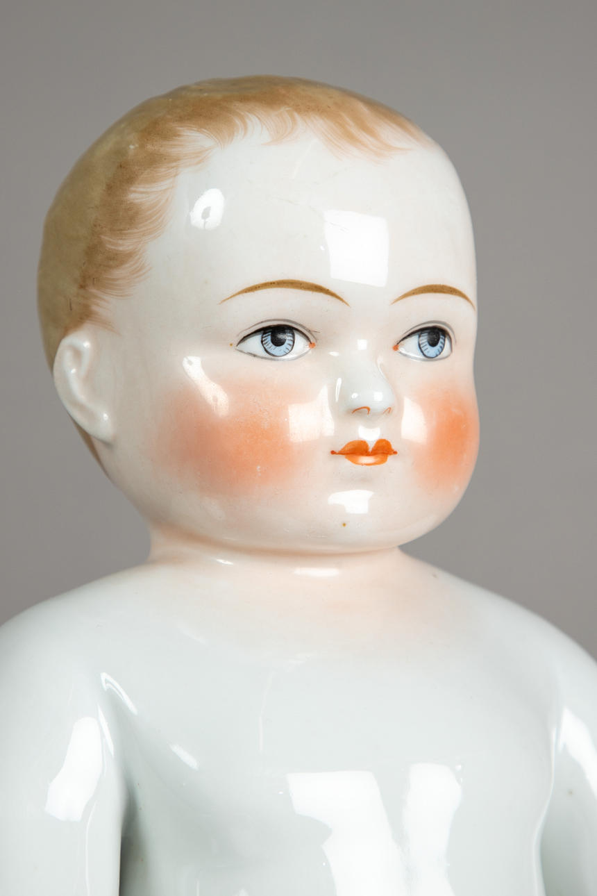 badedukke "Nøgen frø" udført i porcelæn, modelleret og glaseret i hånden, umærket, håndmalet hoved, blå øjne med røde indre øjne, fine linjer og øjenbryn, blond malet hår, ca. 1880, str. ca.: 40 cm.