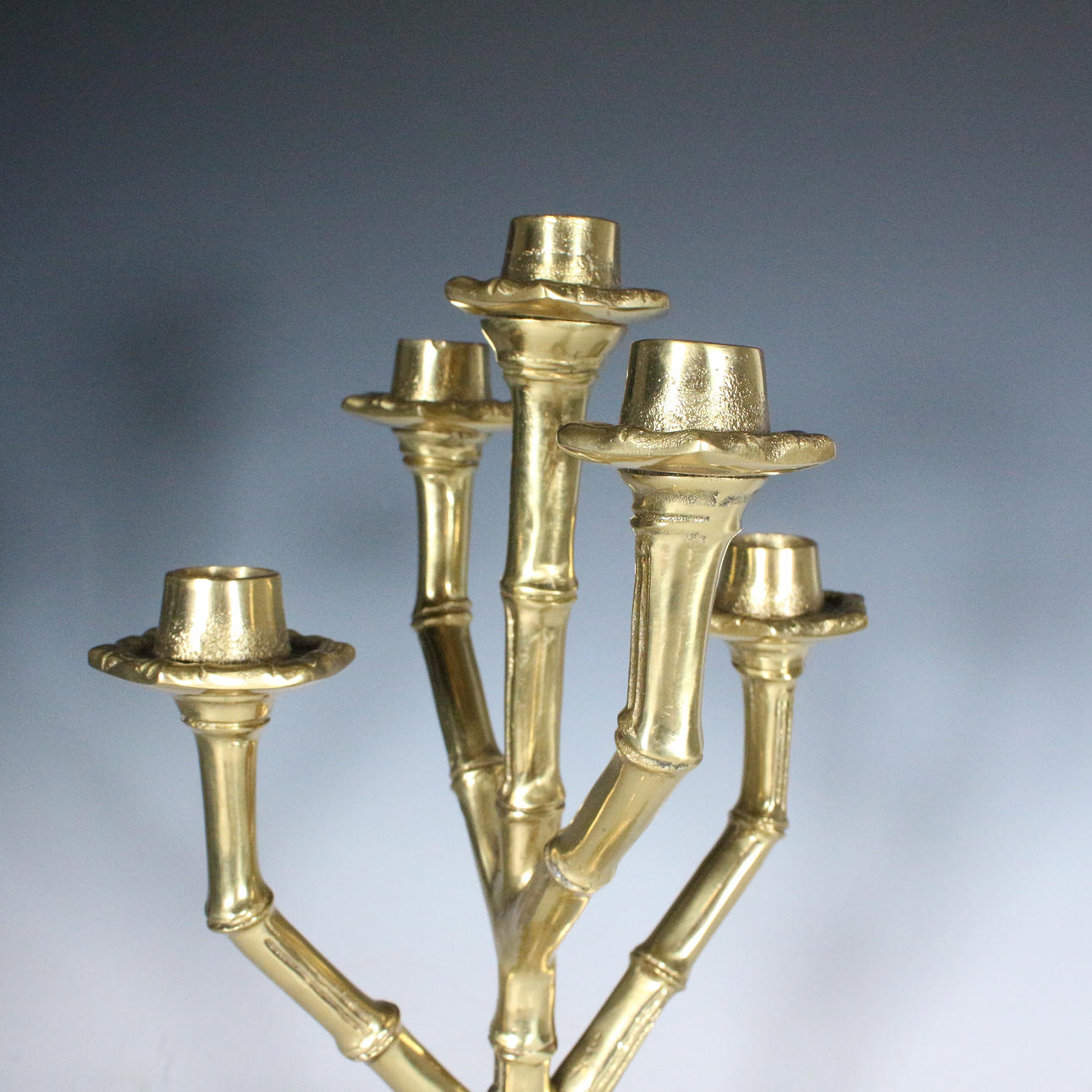 5-armet bambus lysestage lavet af metal med en guldfarvet finish.