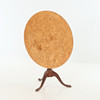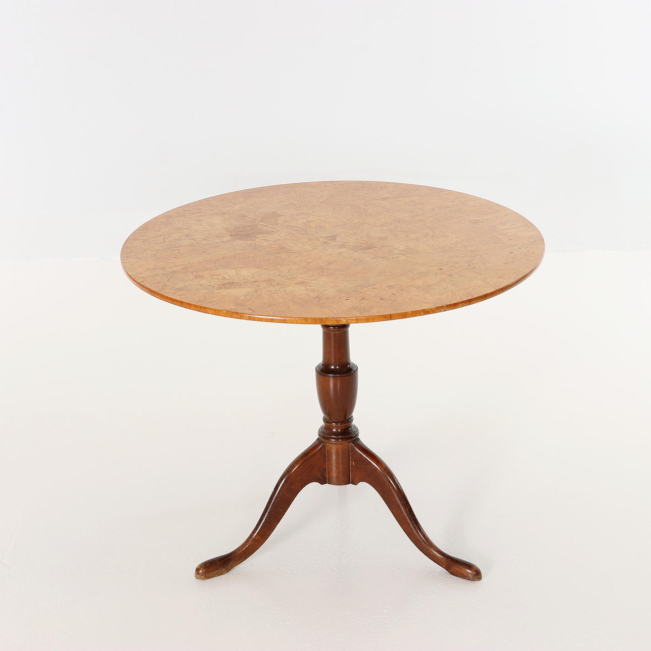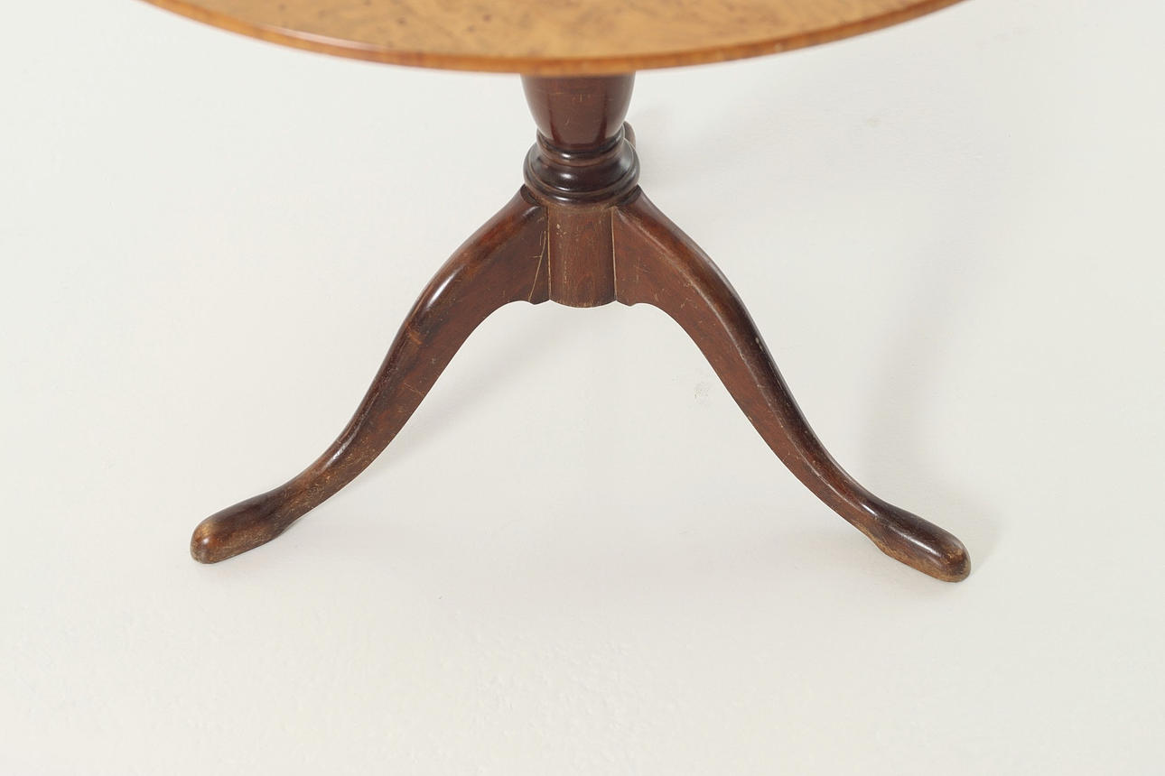 Søjlebord, klapbord, rund plade i fineret Masur birk. Benstel i fineret mahogni. Sverige, første del af det 19. århundrede.
