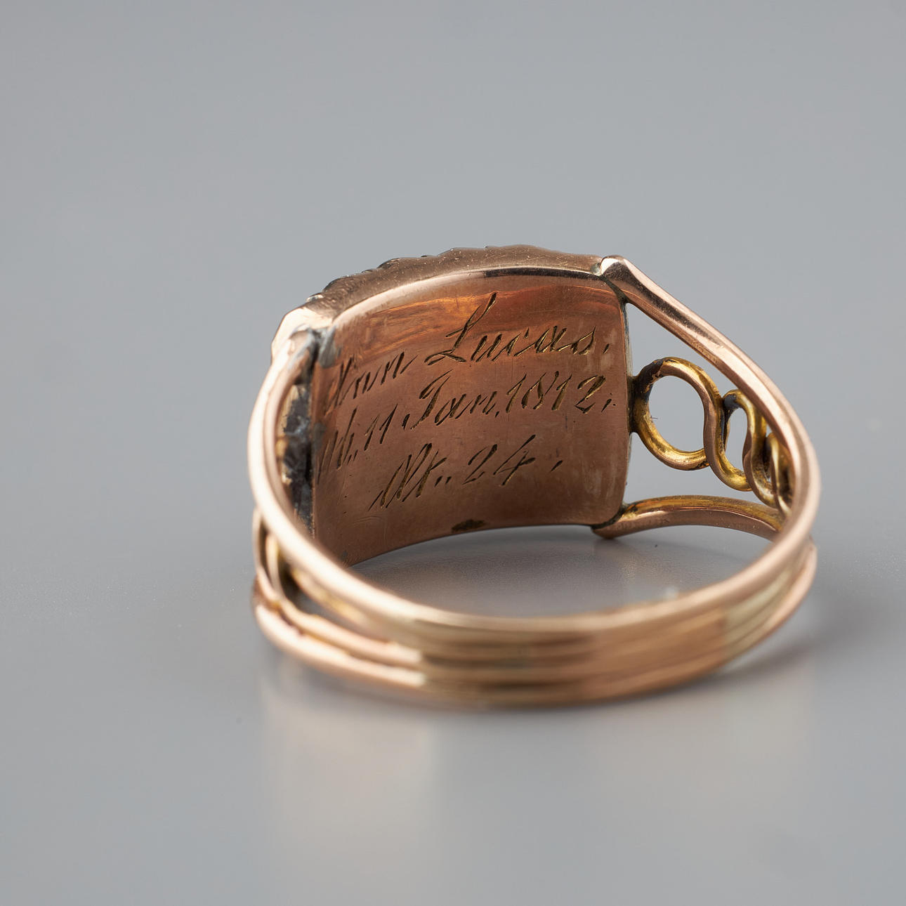 Dekorationsdel 13 x 10 mm, gravering med årgang 1812, ringskinne senere, str. 19, vægt ca 3,9 g.