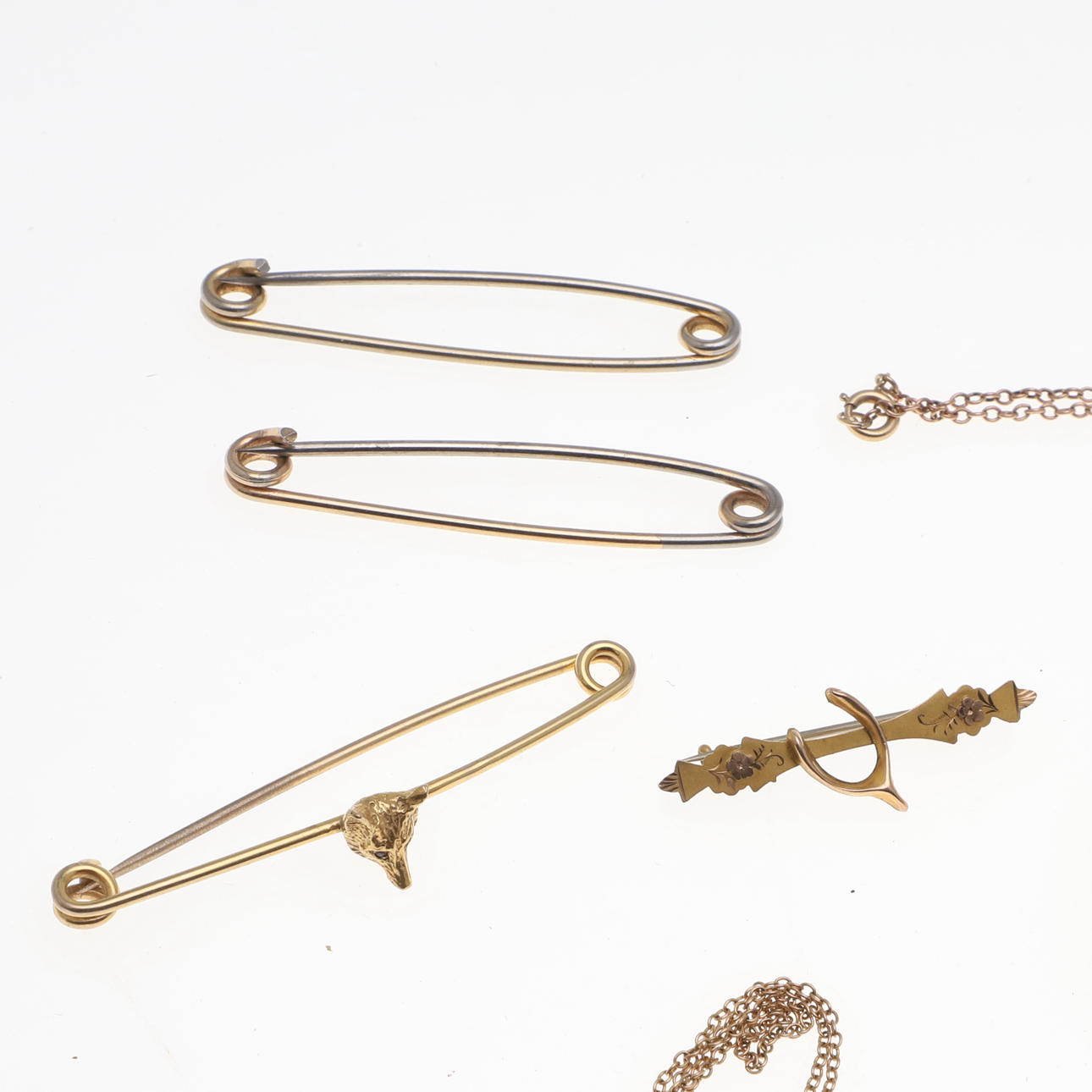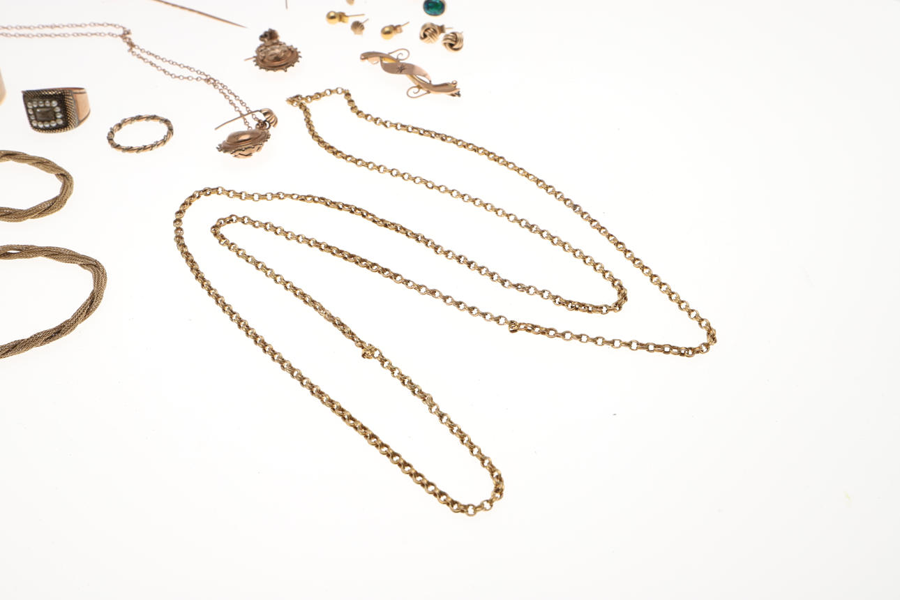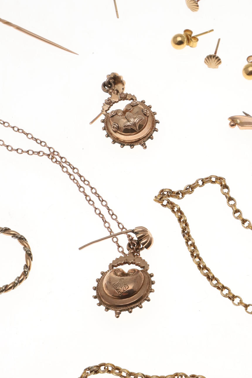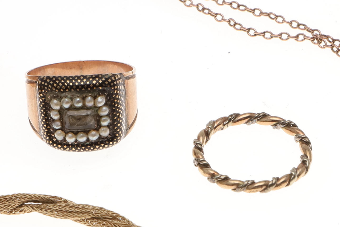 inklusive et damearmbåndsur i guld, en 9 karat guld rævemaske jagtbroche, en George III sort emalje, perle og guld sørgering, en koral og guld pind pin, et par guld dråbe øreringe og andre guld genstande, samlet vægt af alle genstande 52 gram.