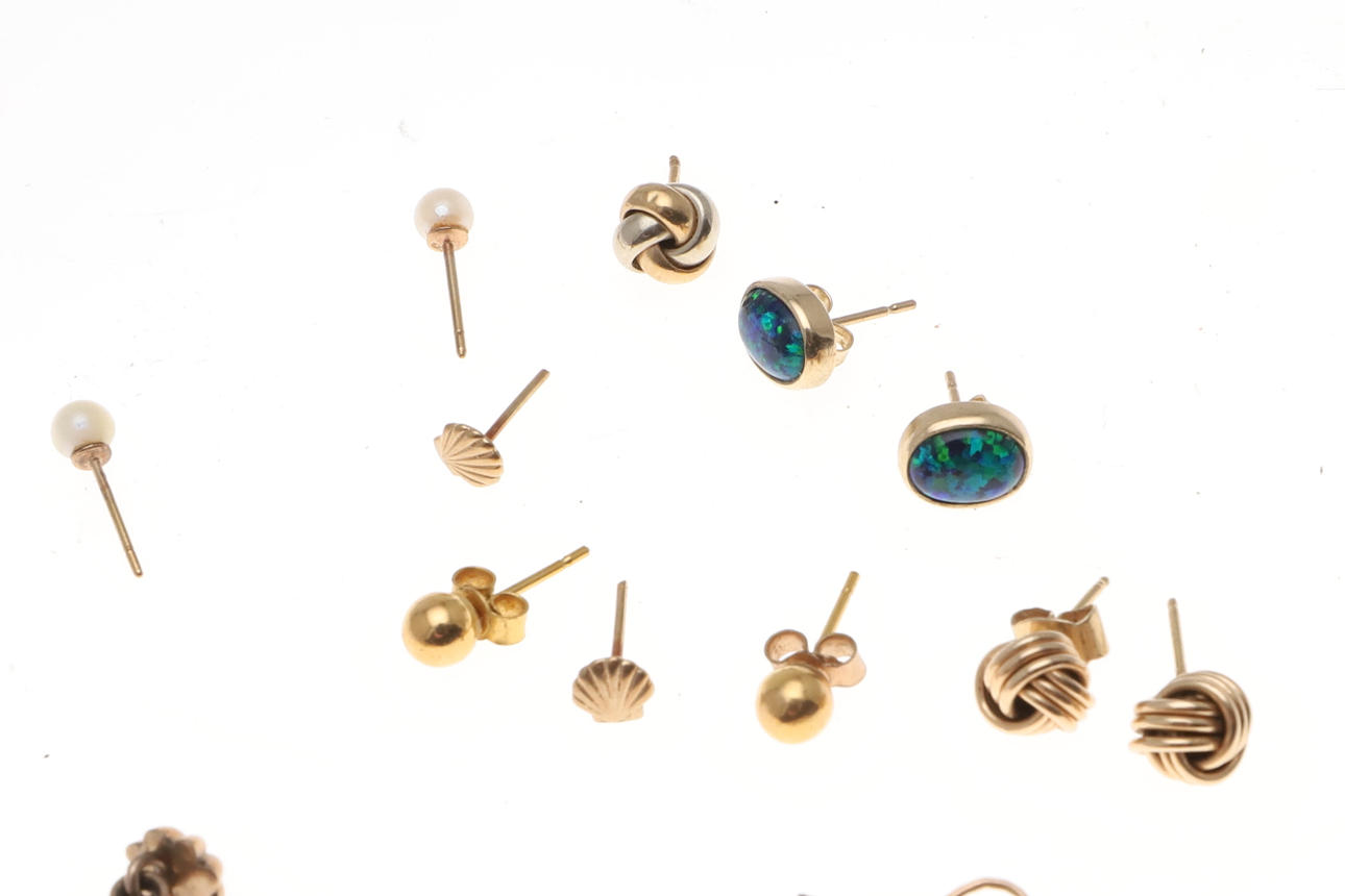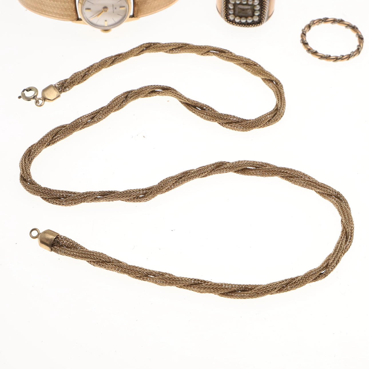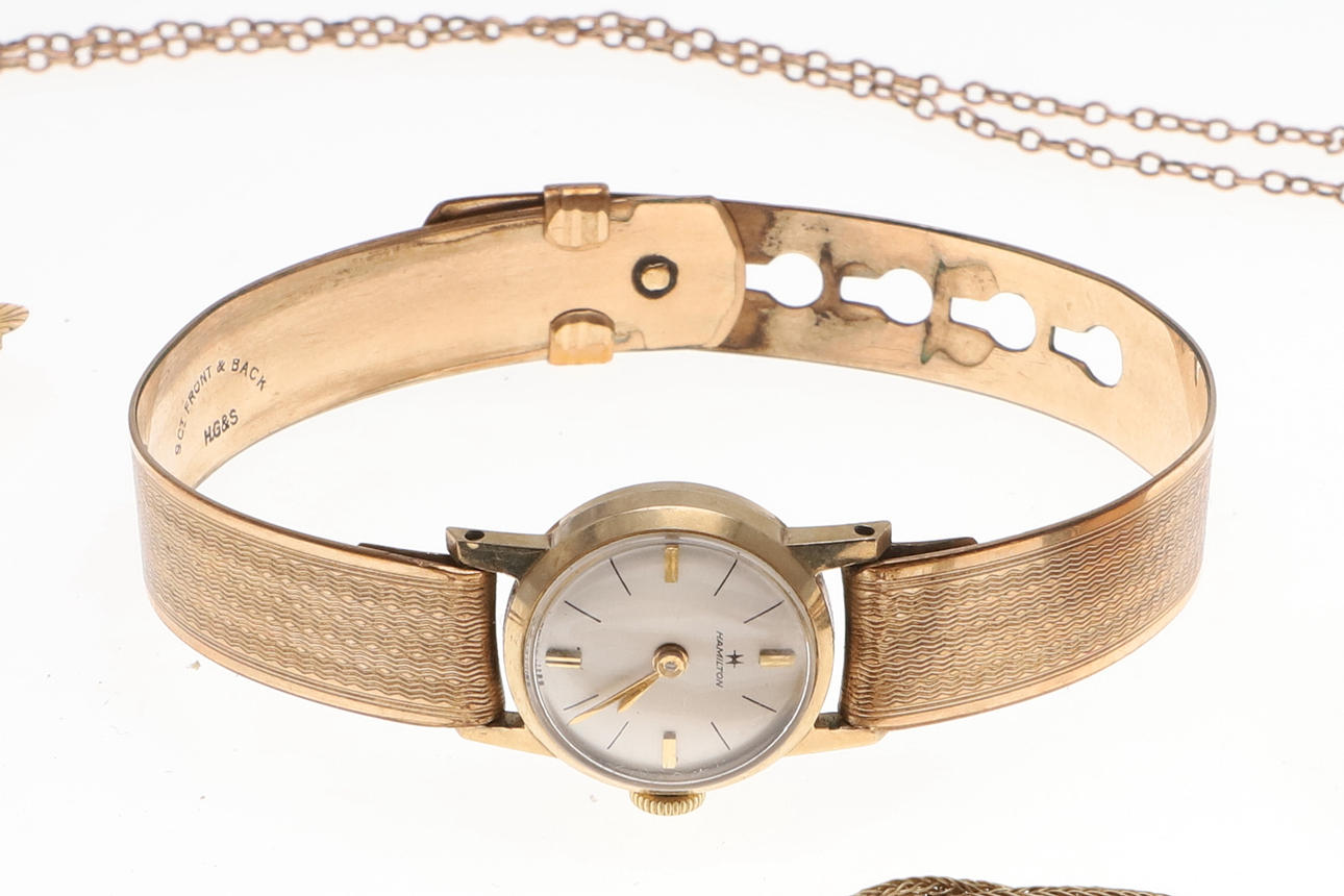 inklusive et damearmbåndsur i guld, en 9 karat guld rævemaske jagtbroche, en George III sort emalje, perle og guld sørgering, en koral og guld pind pin, et par guld dråbe øreringe og andre guld genstande, samlet vægt af alle genstande 52 gram.