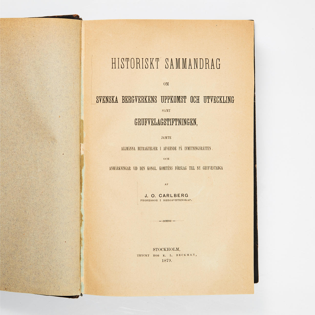 CARLBERG, J. O. Historisk sammenfatning af svenske mineselskabers tilblivelse og udvikling og minelovgivningen samt almindelige betragtninger angående bestikkelsesret og bemærkninger ved det Kongl. Udvalgets forslag til nyt minevedtægt. Stockholm, K. L. Beckman, 1879.