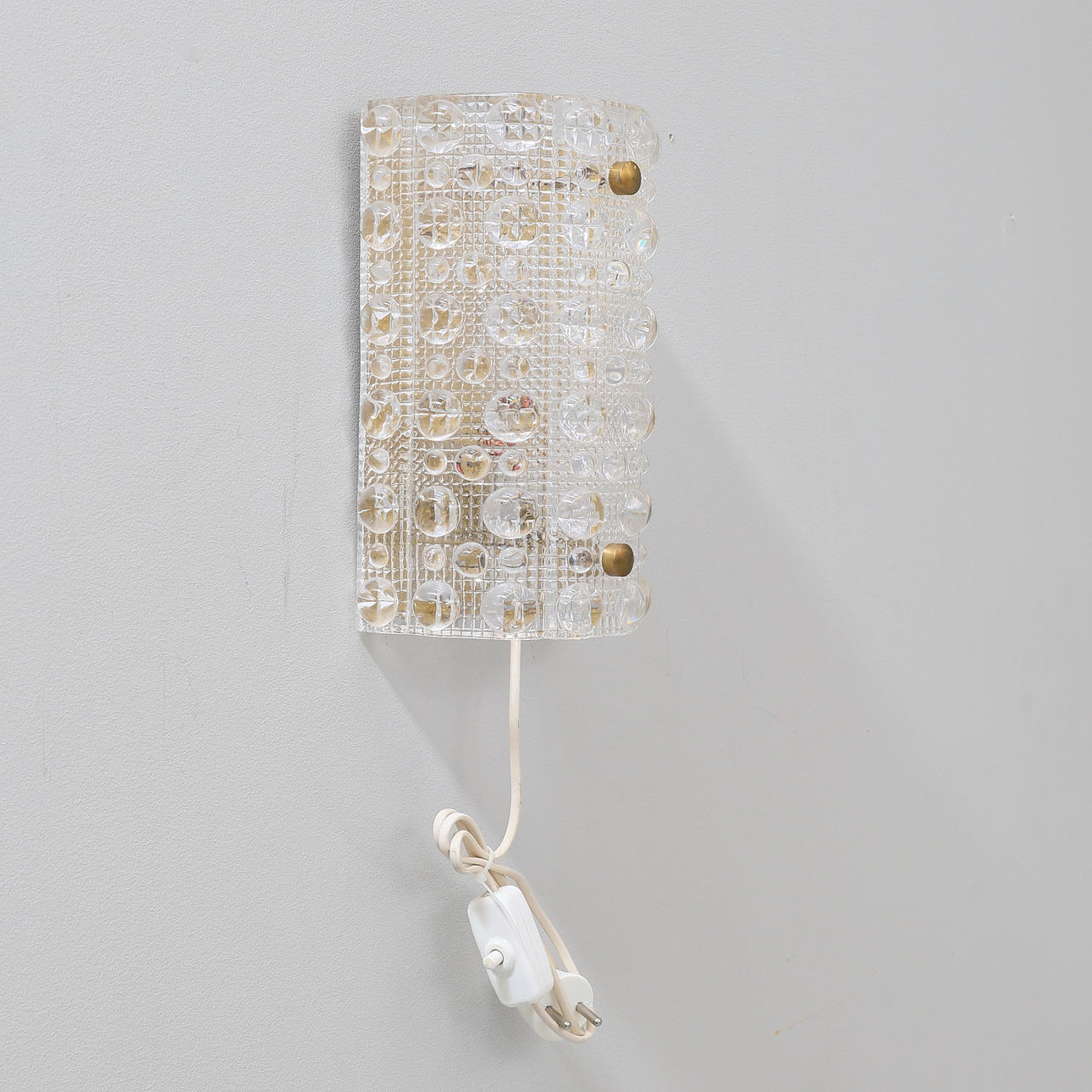 Vægbeslag og skruer i messing. Glaskuppel i formstøbt glas med dekoration af halvcirkler. 1 lyspunkt. Mærket med etiket. Længde ca 26 cm.