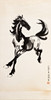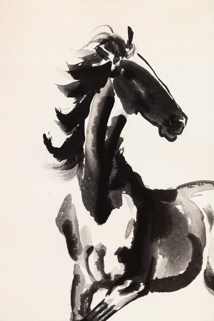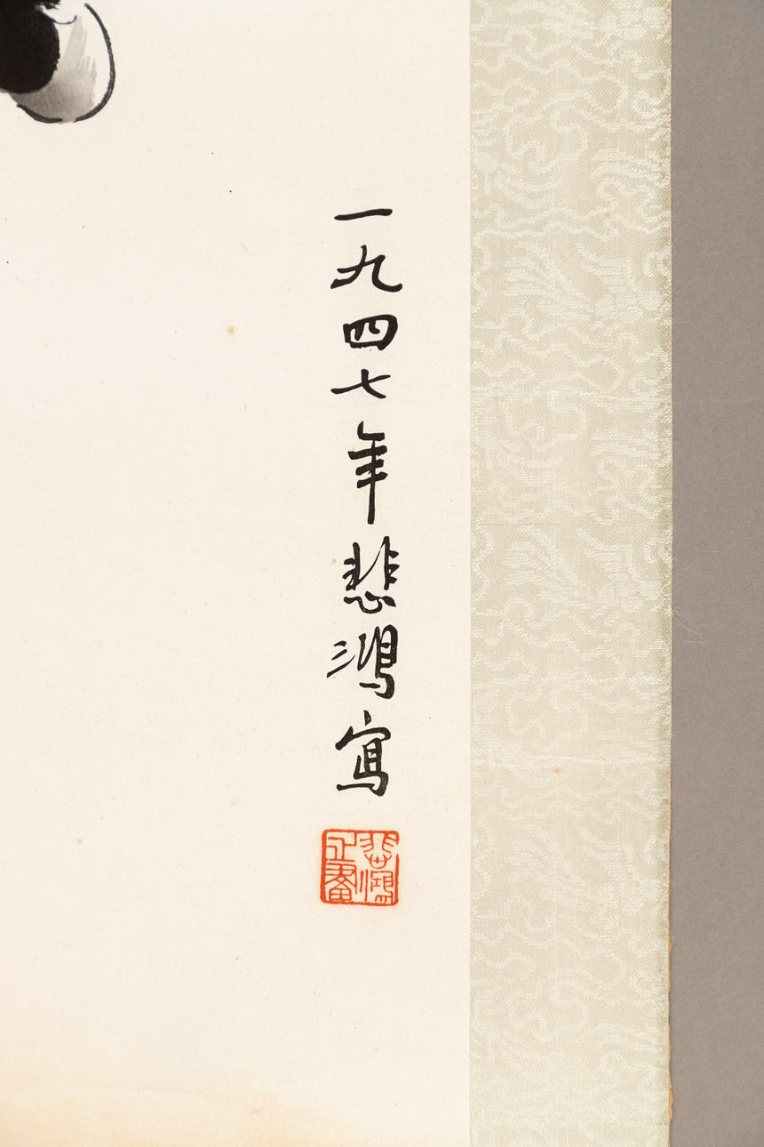Træsnit på rispapir. Signaturstempel: Bei Hong zhi hua (悲鸿之画) ca. 53x102 cm, med brokade passepartout, ca. 63x116 cm.