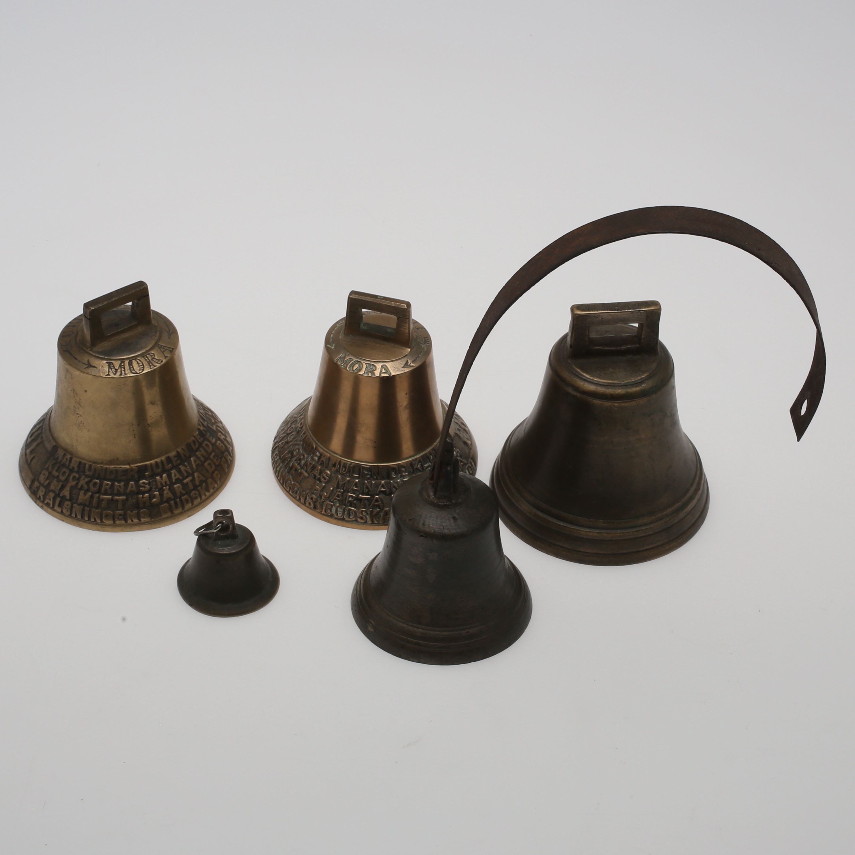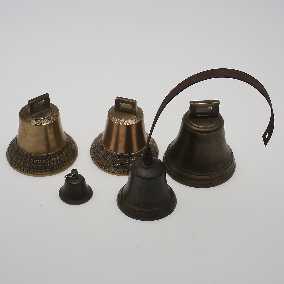 261373. VÄLLINGLKLKLOR, 5 stk, mest Mora, messing.