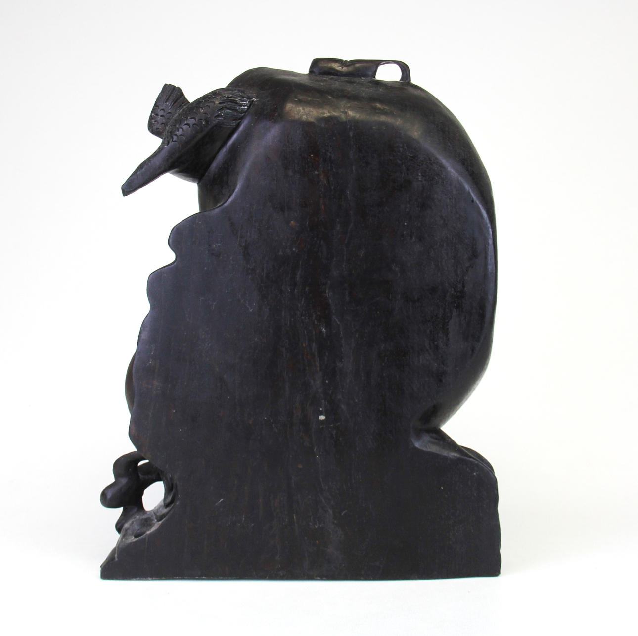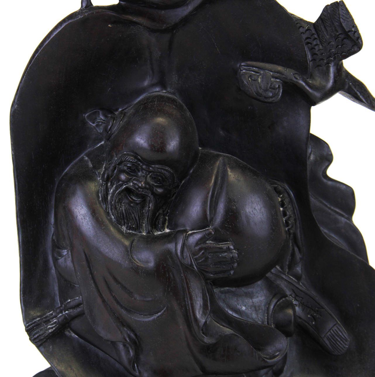 En stor kinesisk håndskåret træfigur af en heldig gud, H. 38,5 cm.