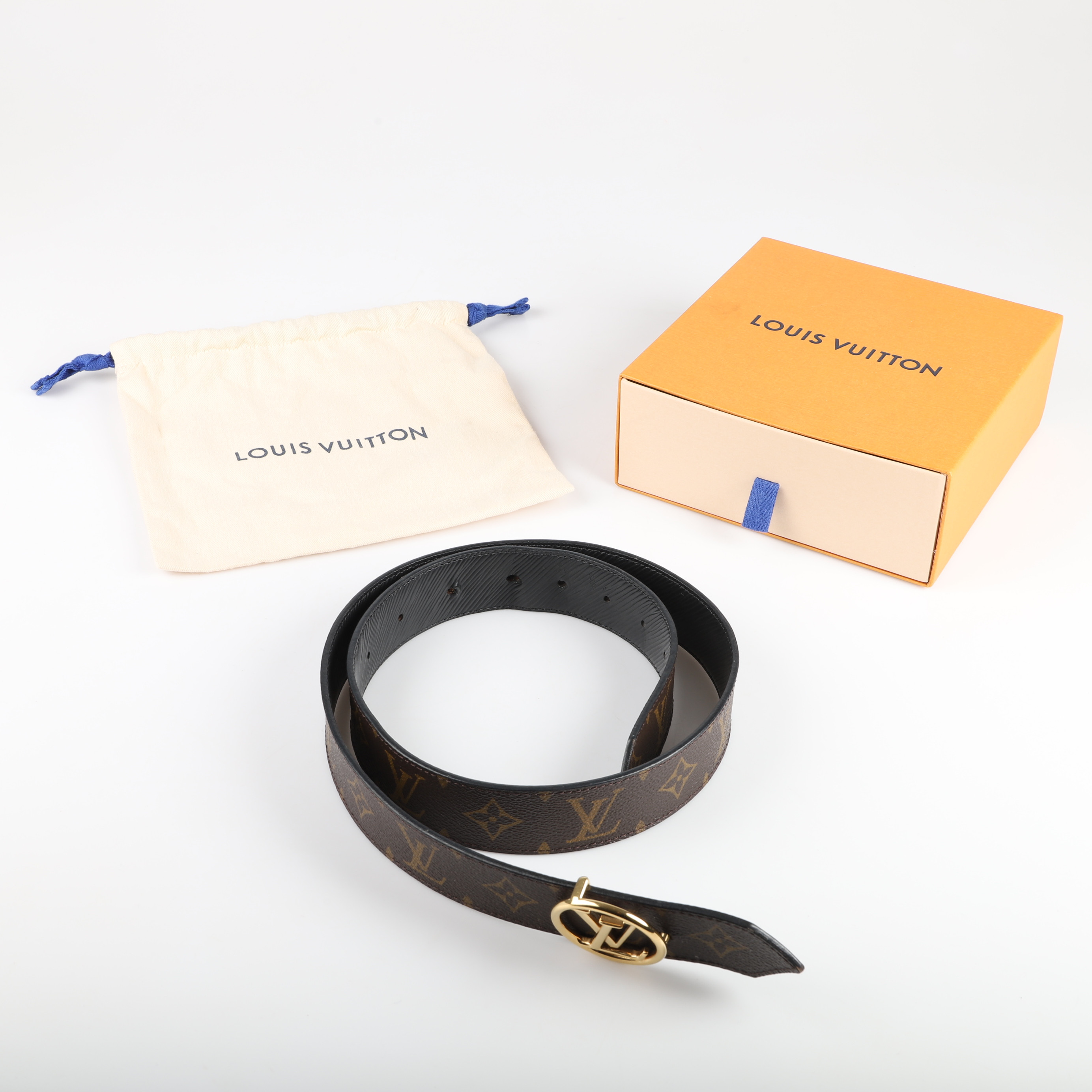 2625947. LOUIS VUITTON. Bælte, "LV Circle", læder med monogramlærred.
