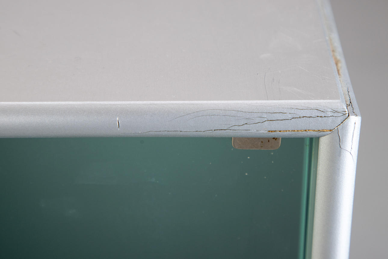 Alders- og slidtegn, ridser i overfladen og enkelte steder revner i materialet.