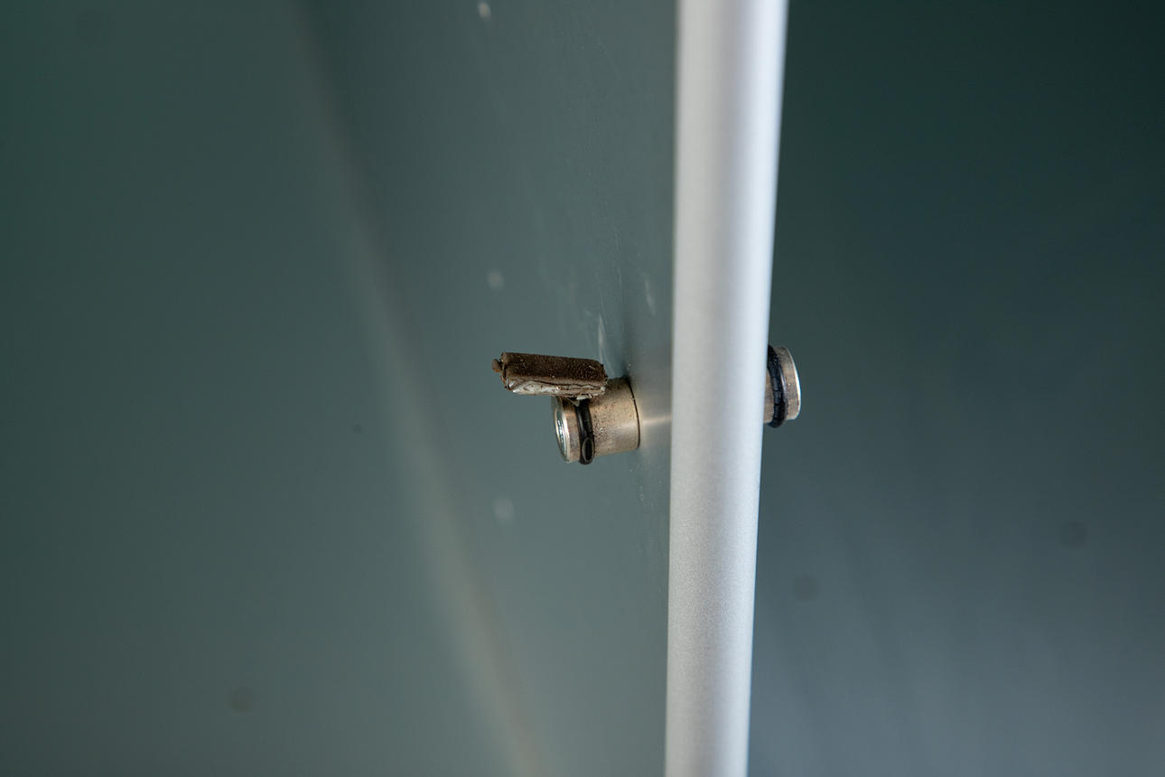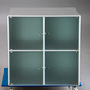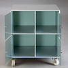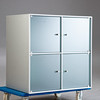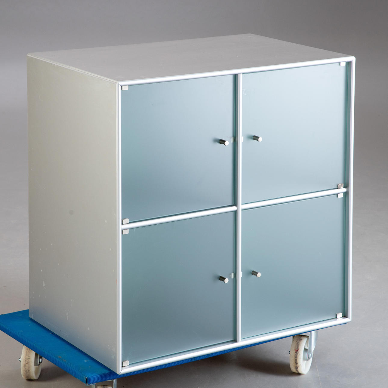 Montana møbler. Vitrineskab i sølv med 4 individuelle glaslåger og 4 rum bagved.