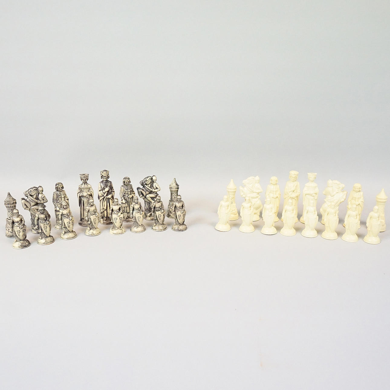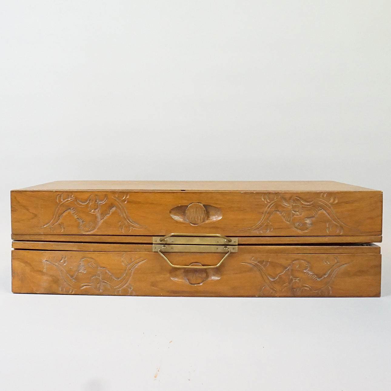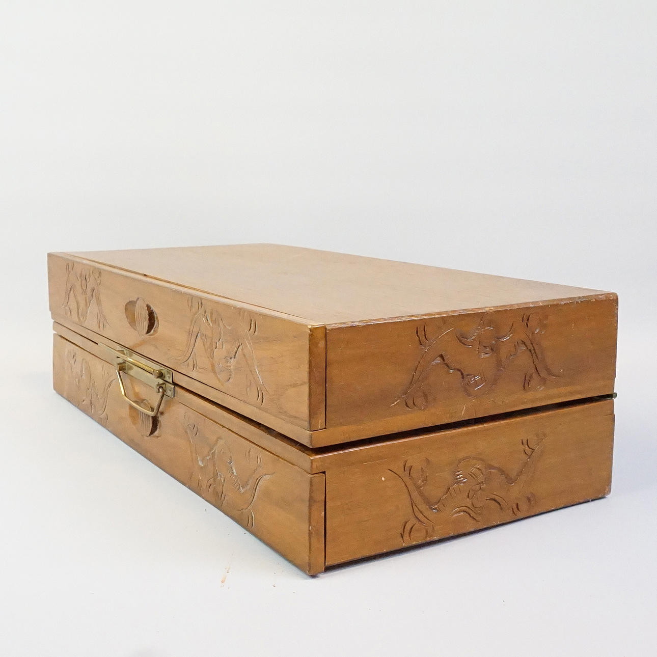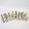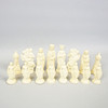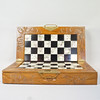 Trææske med skåret dekoration, spillebane i kompositmateriale, 32 stk i plast.
