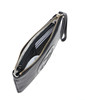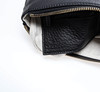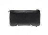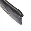 Konvoluttaske i sort læder med lynlås i gult metal. Interiør i lyst hørlærred med sidelomme i sort læder med plads til 6 kort og lynlåsrum. Mål ekskl. rem ca 12x22 cm.