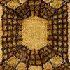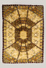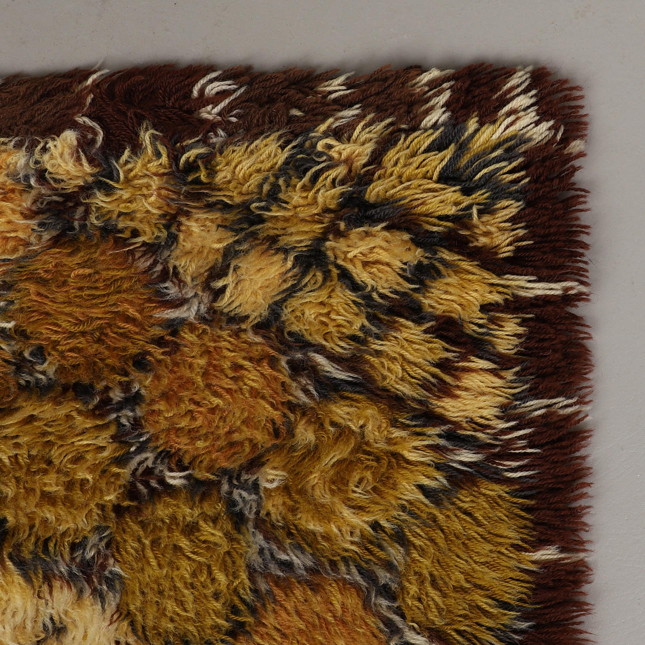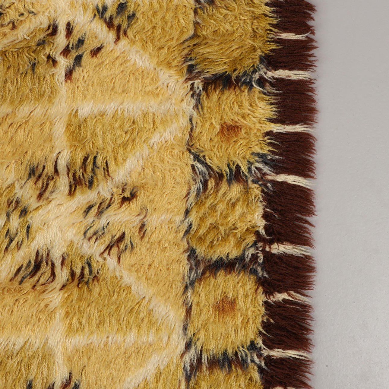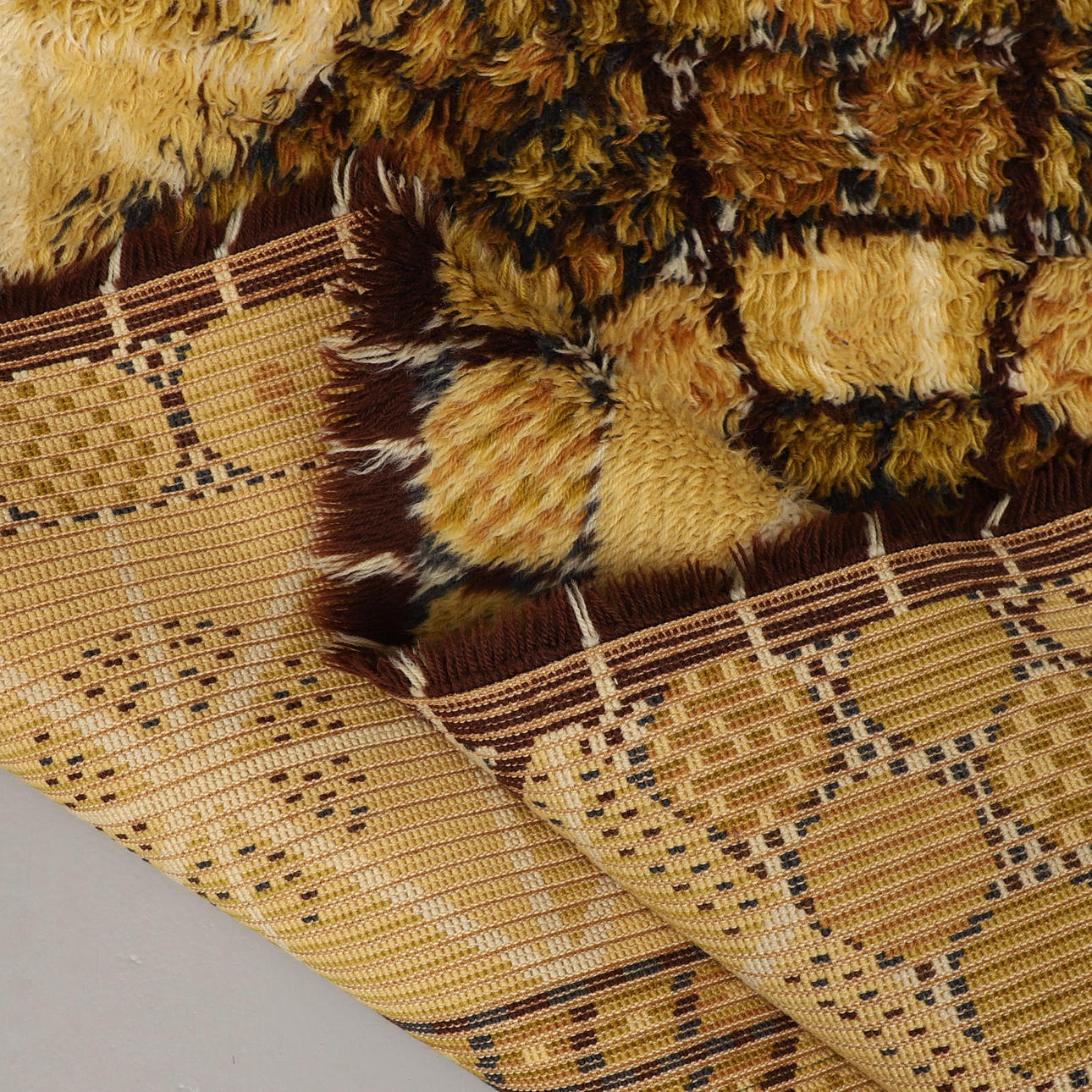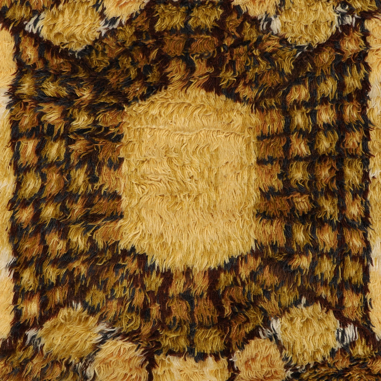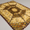Geometrisk mønster i gul og brun. Cirka 192 x 135 cm.