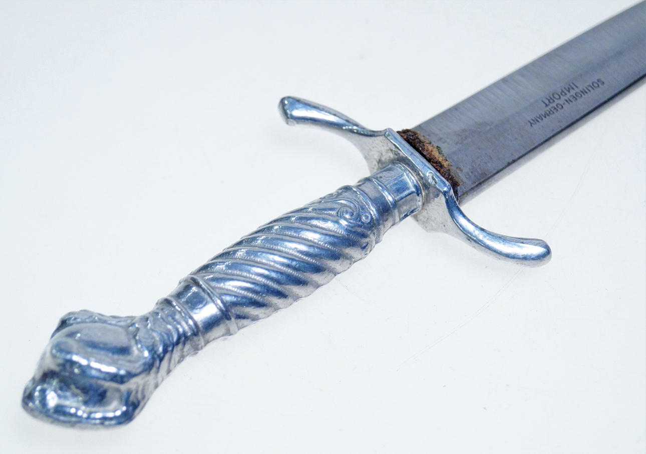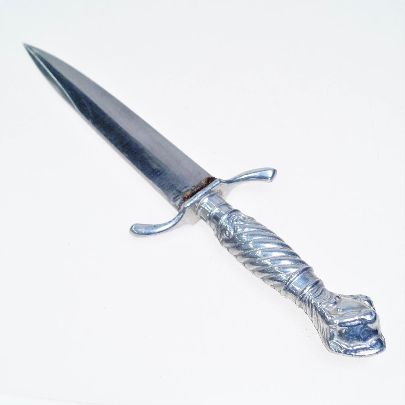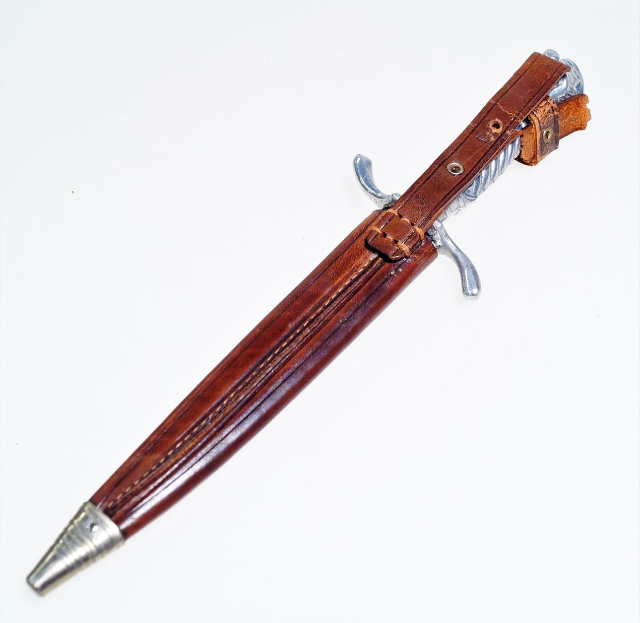 Knivskede i læder med metaldekoration. Bladlængde ca 16 cm. Samlet længde ca 27 cm.