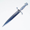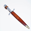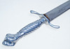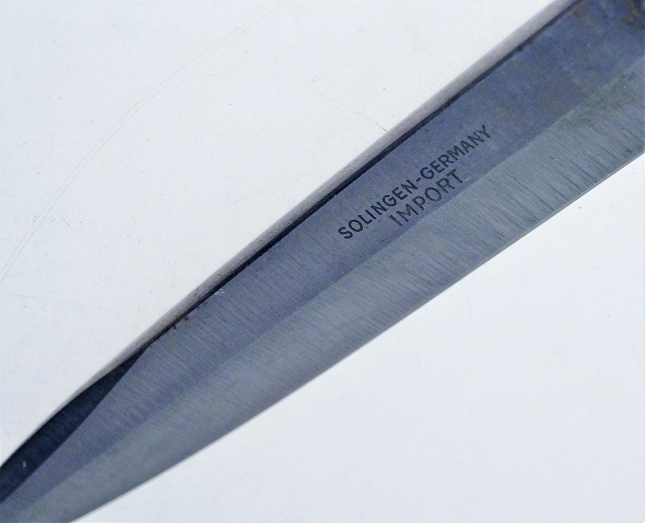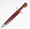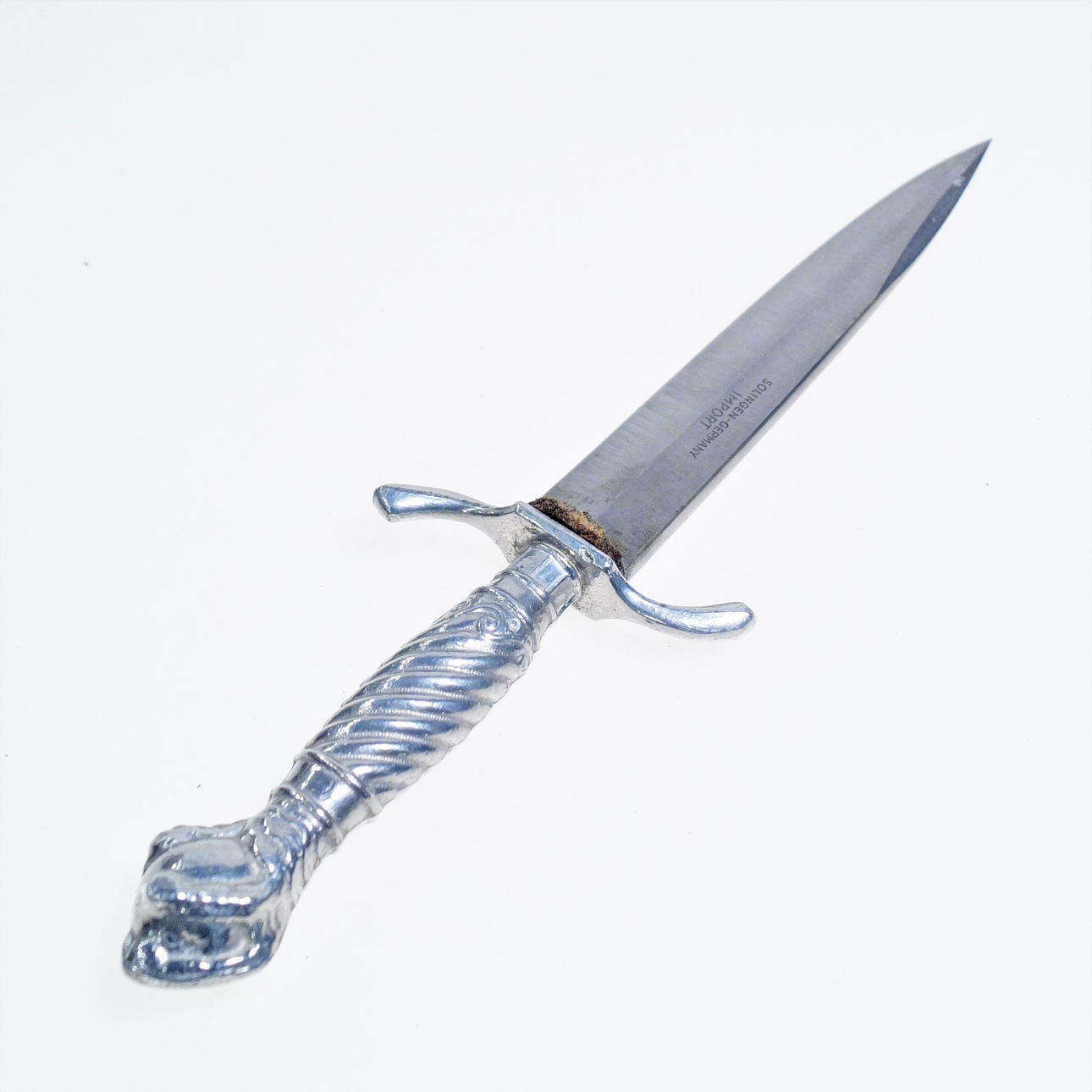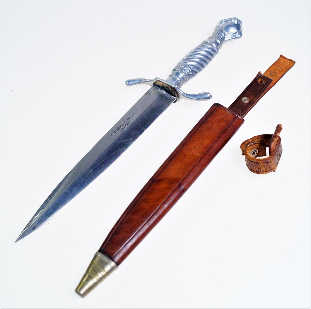 Knivskede i læder med metaldekoration. Bladlængde ca 16 cm. Samlet længde ca 27 cm.