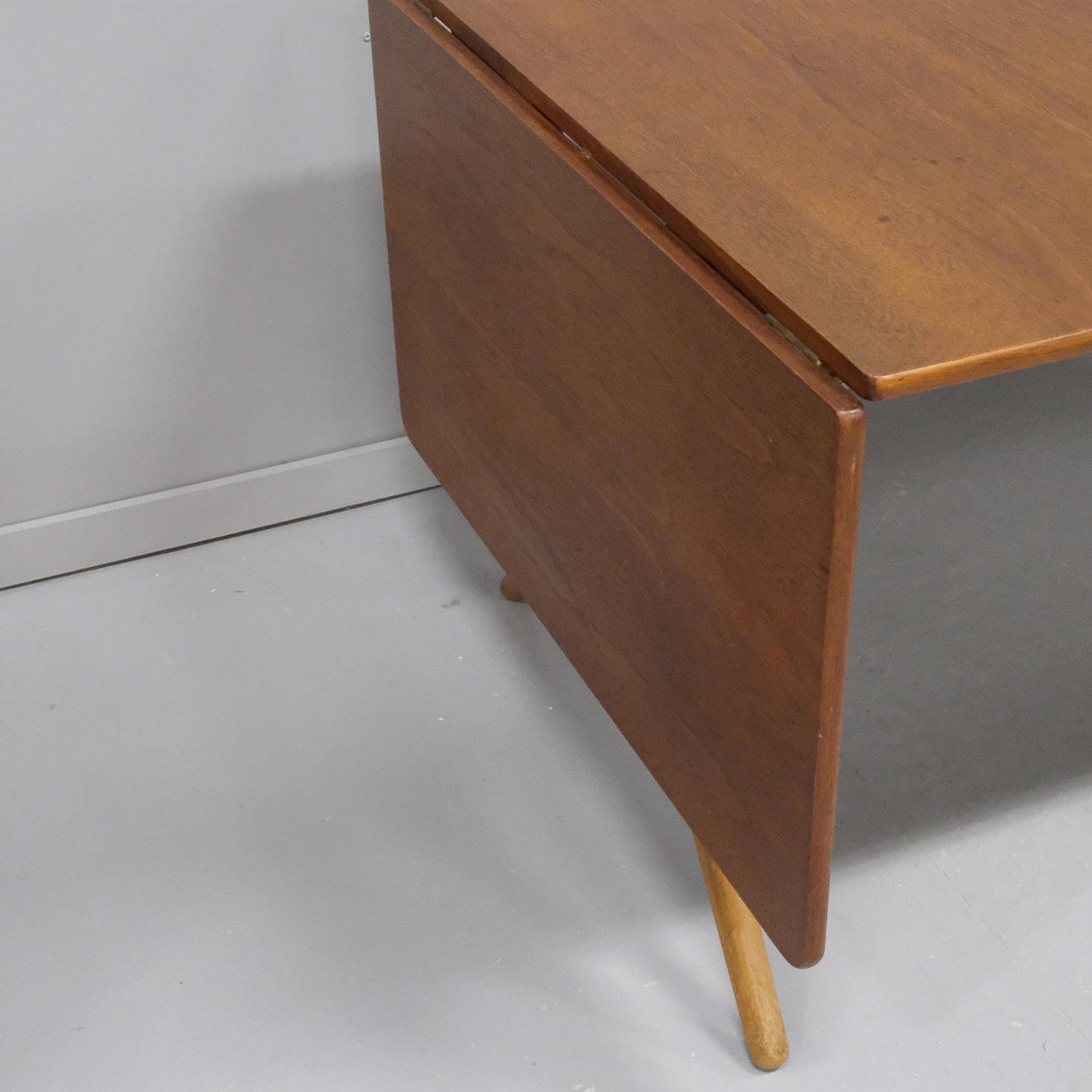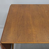 Teak og eg, med to klapper, messing seler, 1950'erne/60'erne, poleret MAKE: ANDR. TUCK ARCHITECT: HANS J WEGNER, MADE IN DENMARK., højde 72cm, længde 128+50+50cm, bredde 86cm.