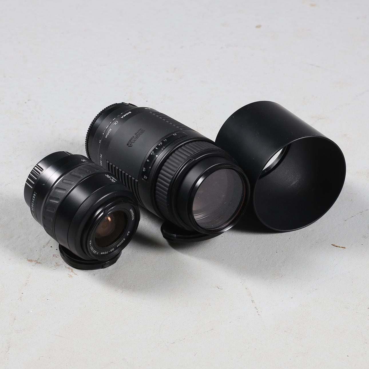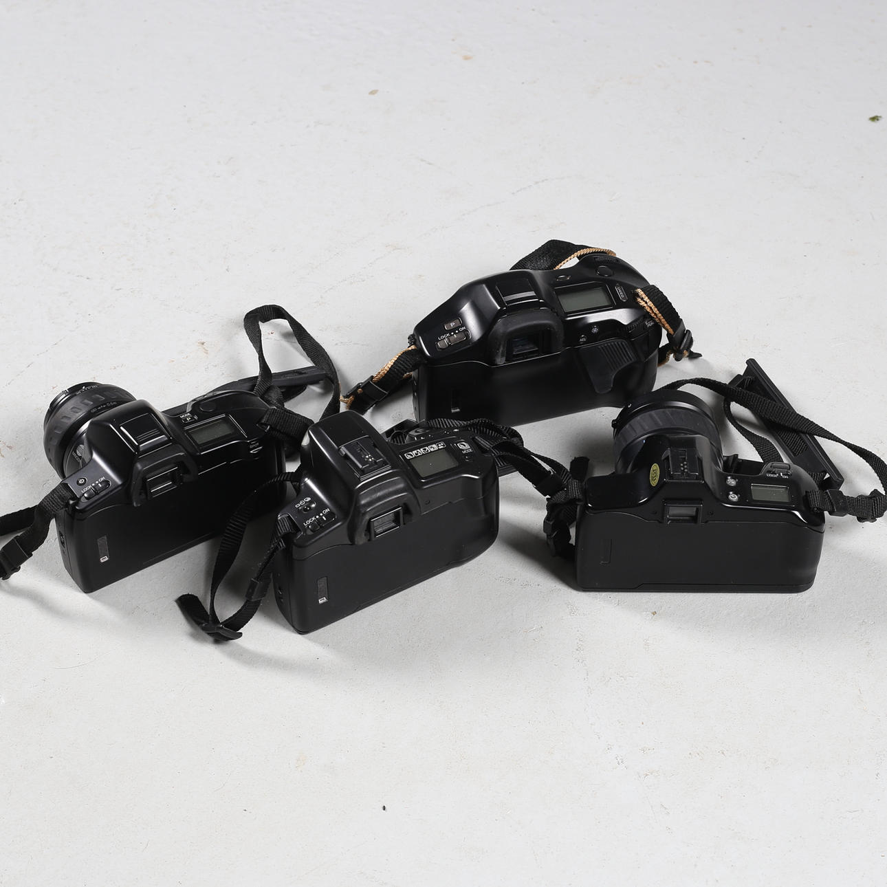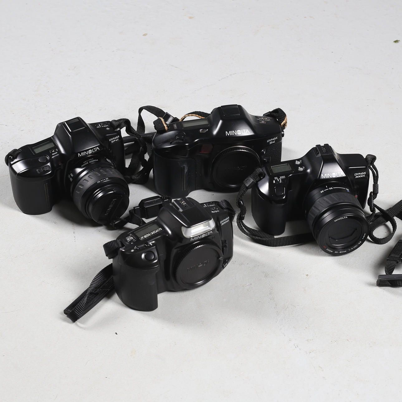 1 kamera Minolta Dynax 3000Si med objektiv Minolta AF Zoom 35-70 mm 1 kamera Minolta Dynax 3000i med objektiv Minolta AF 35-80 mm, med instruktioner 1 kamerahus Minolta Dynax 9xi 1 kamerahus Minolta Dynax SPxi 1 flash Minolta Program D 3 Flash controller Minolta MFC-1000 1 stk objektiv Sigmna 75-100 m 1:4-5.6 1 stk objektiv Minolta AF 35-80mm.