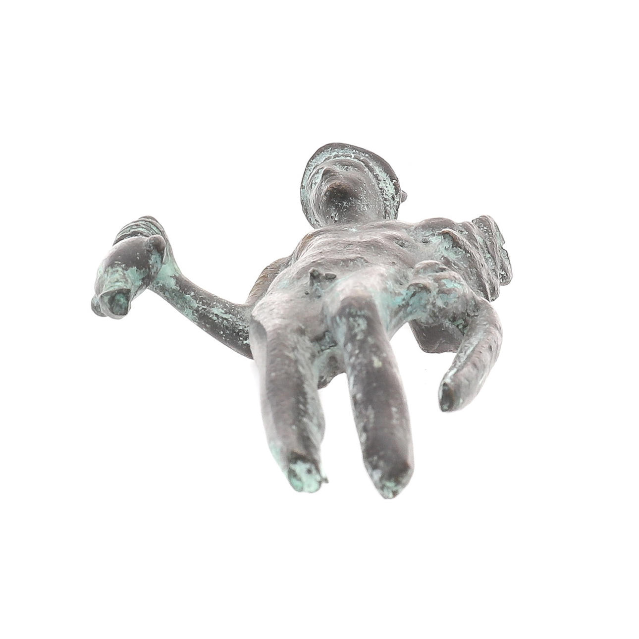 slidt og mærket, med fødder og base mangler, tegn på oxidation.