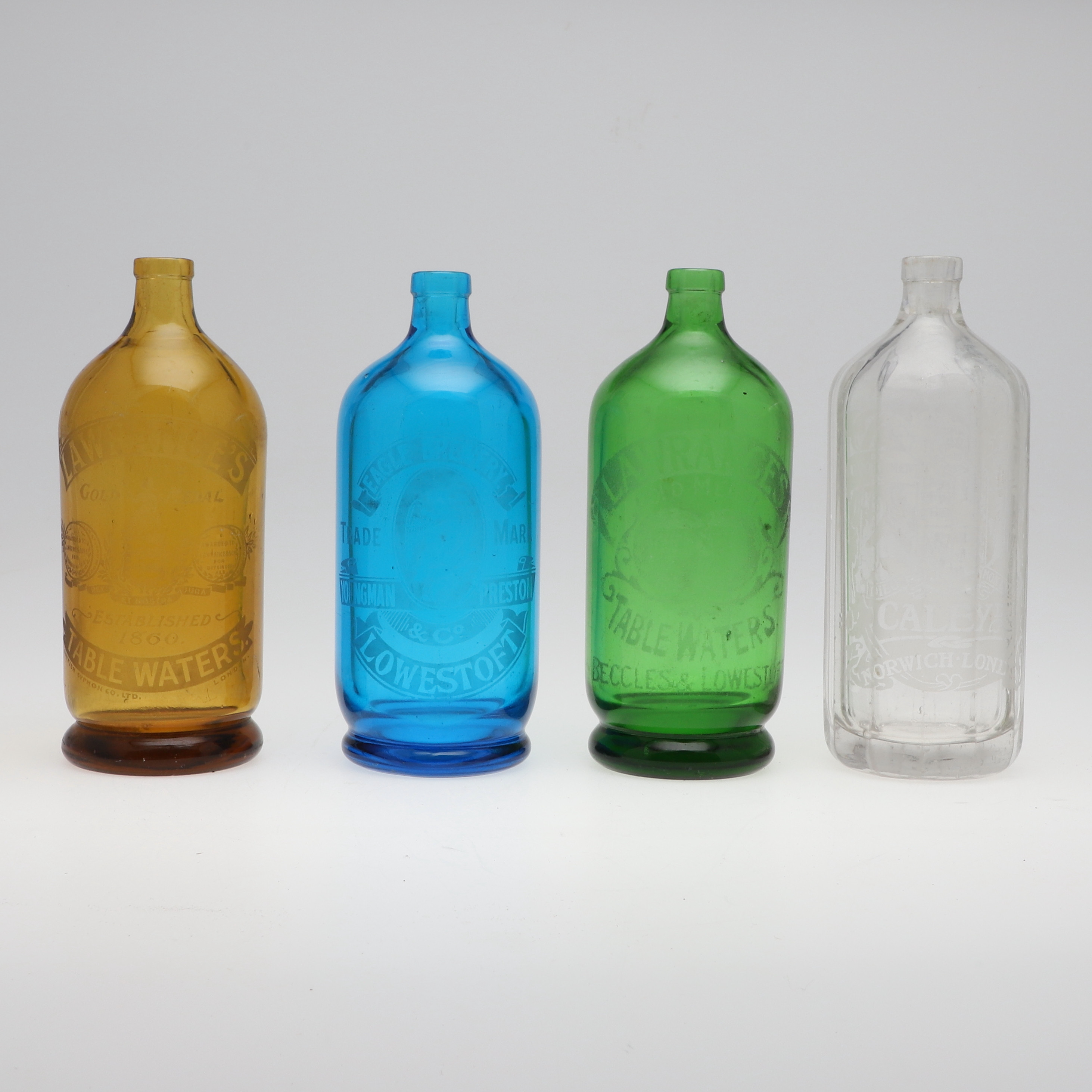 2688510. FIRE DEKORATIVE FARVEDE GLAS FLASKER.