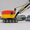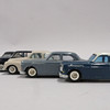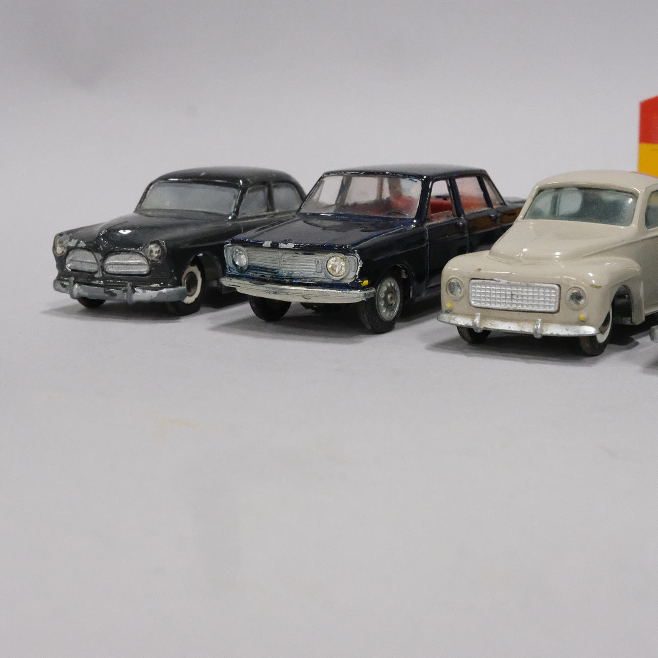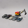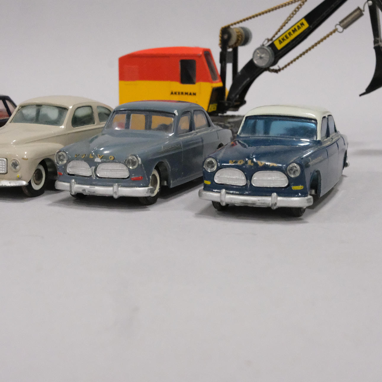 Fem Volvo personbiler, længde ca 10 cm og en gravemaskine, længde 14 cm.