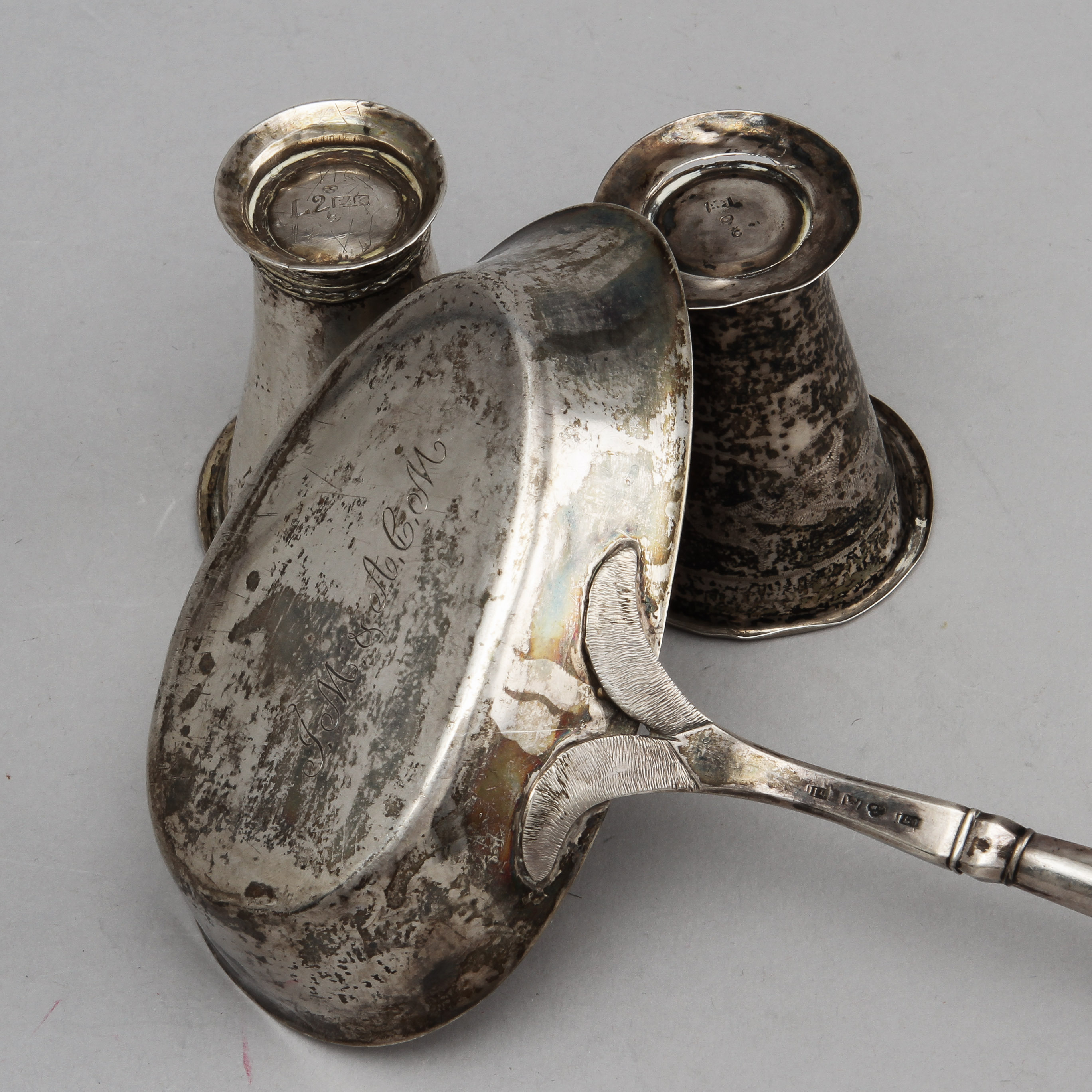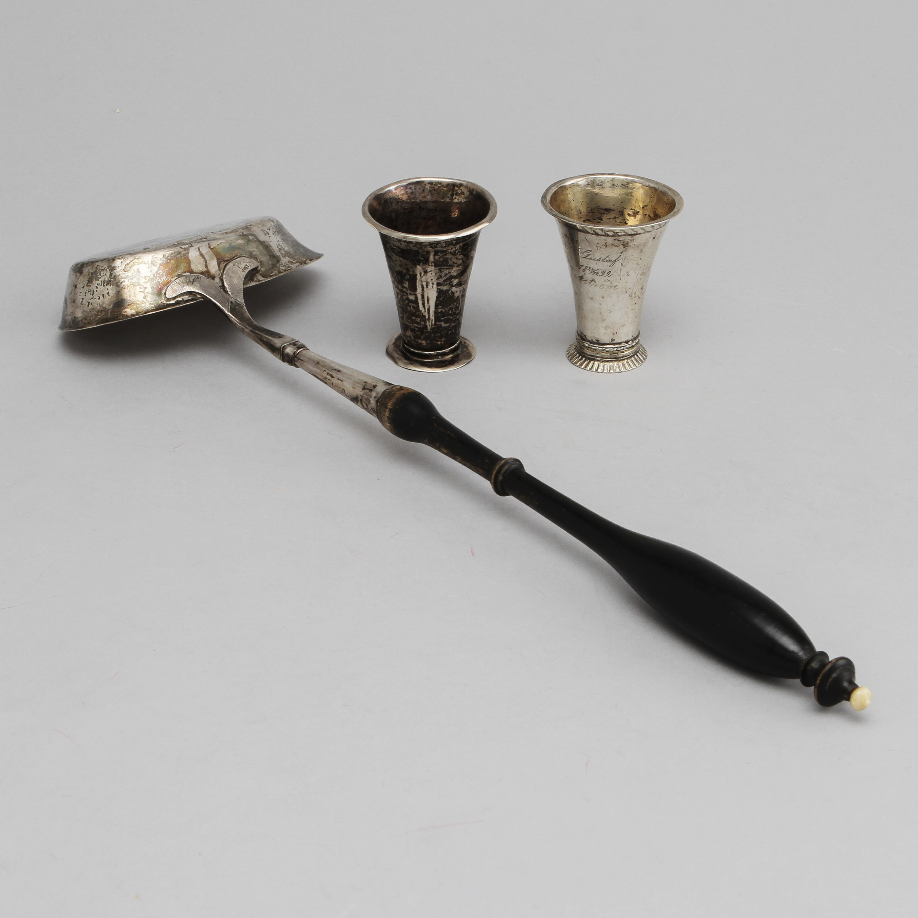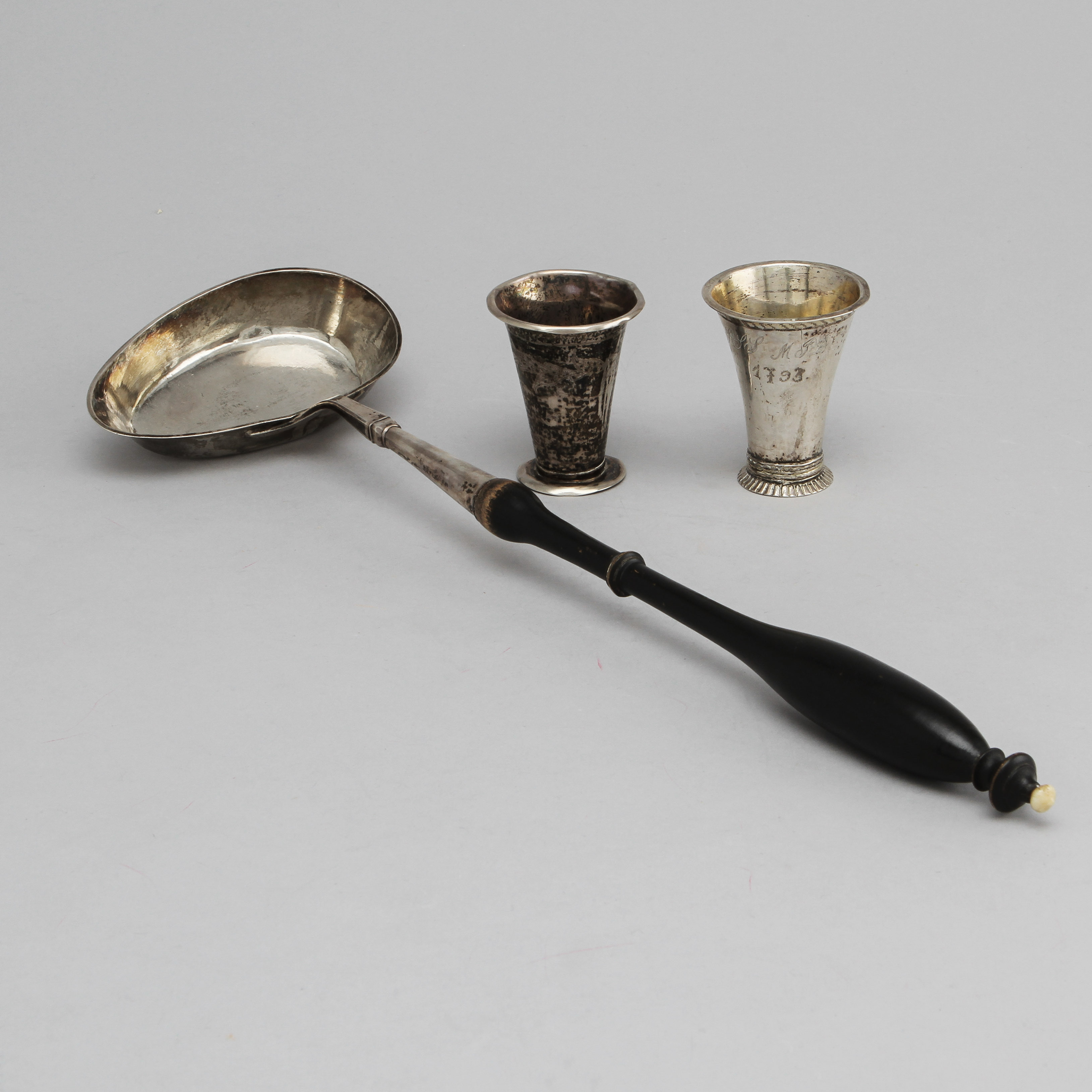 269918. SØLV, 3 dele, 2 kopper og suppeske.