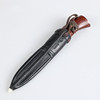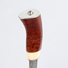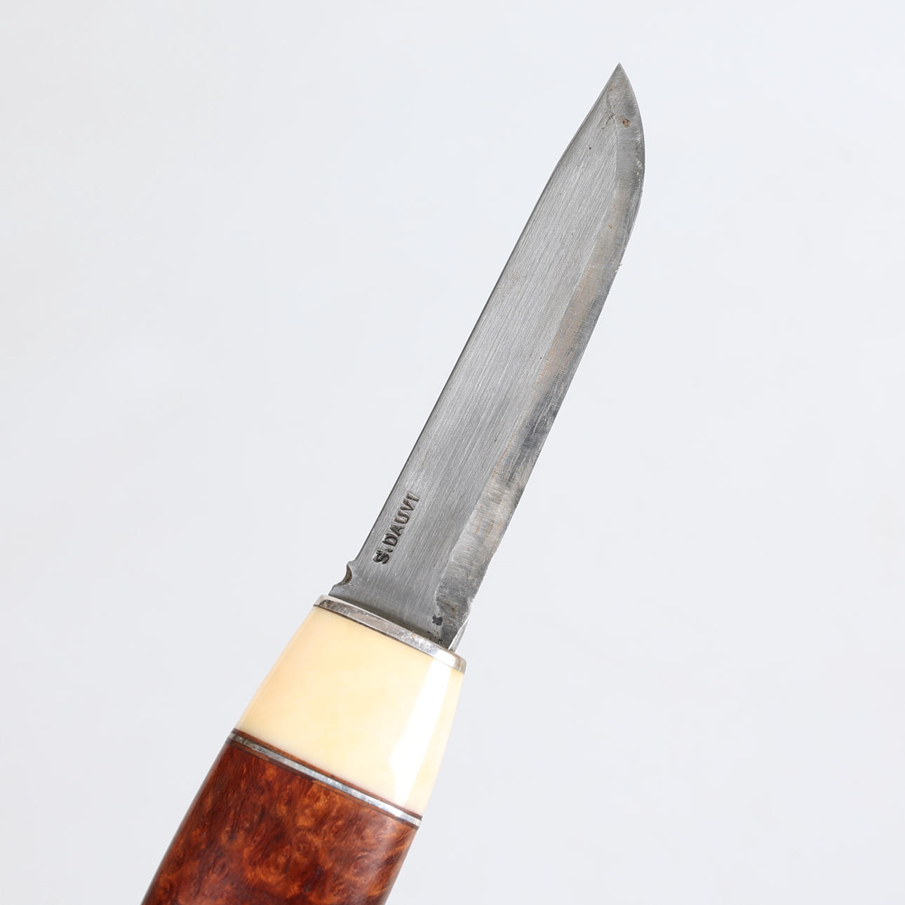 Håndtag i rørtræ og topstykke i sterling sølv Skede og kniv er signeret HV og dateret 1986 Knivblad af Sigurd Dauvi fra Norge Mærket S. Dauvi Længde 21 cm.