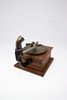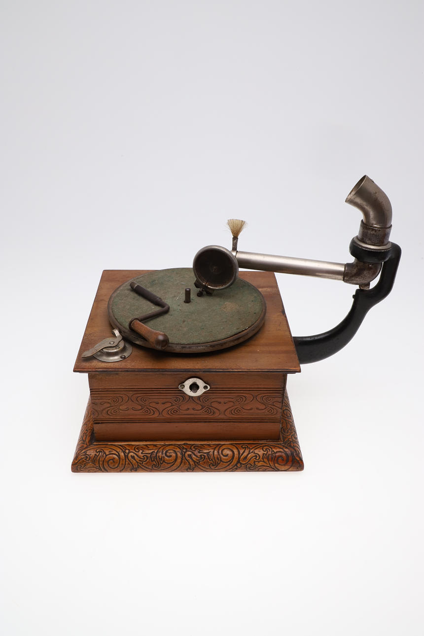En tidlig 20thc grammofon, med udskåret dekoration og med sin soundbox og blikhorn. I funktionsdygtig stand og med sin opruller, også med to plader. Base af grammofon 28 cm x 27 cm, horn 39 cm højt, 34 cm diameter.