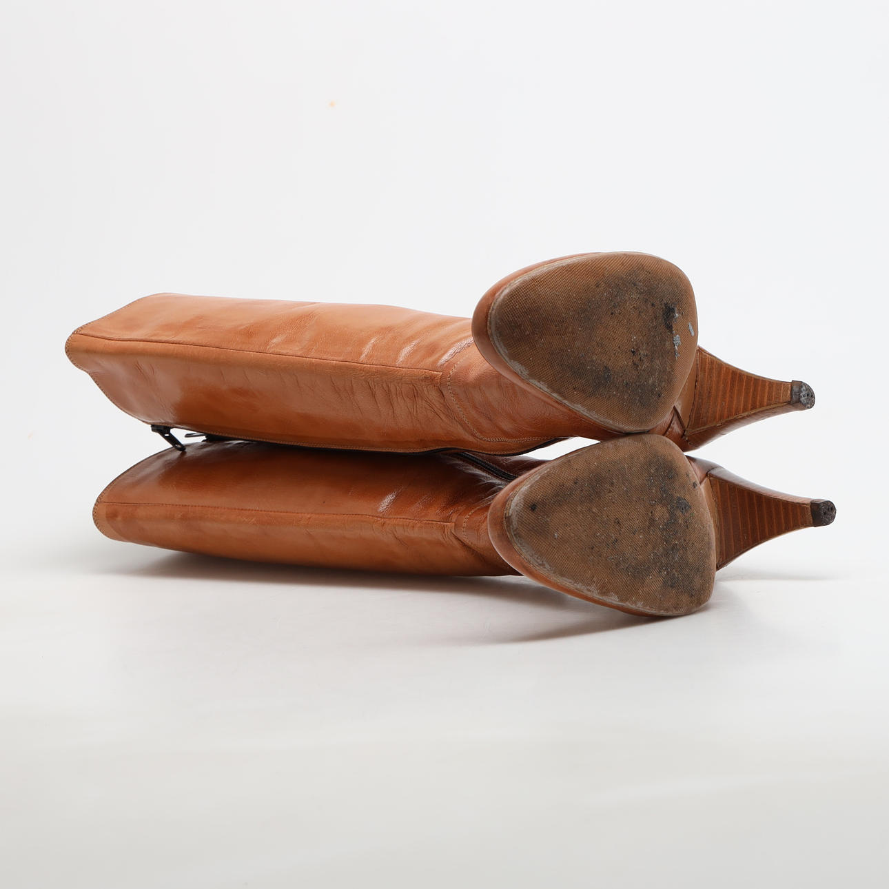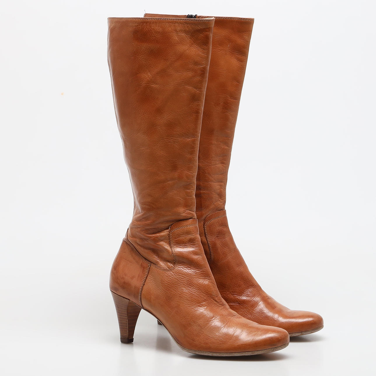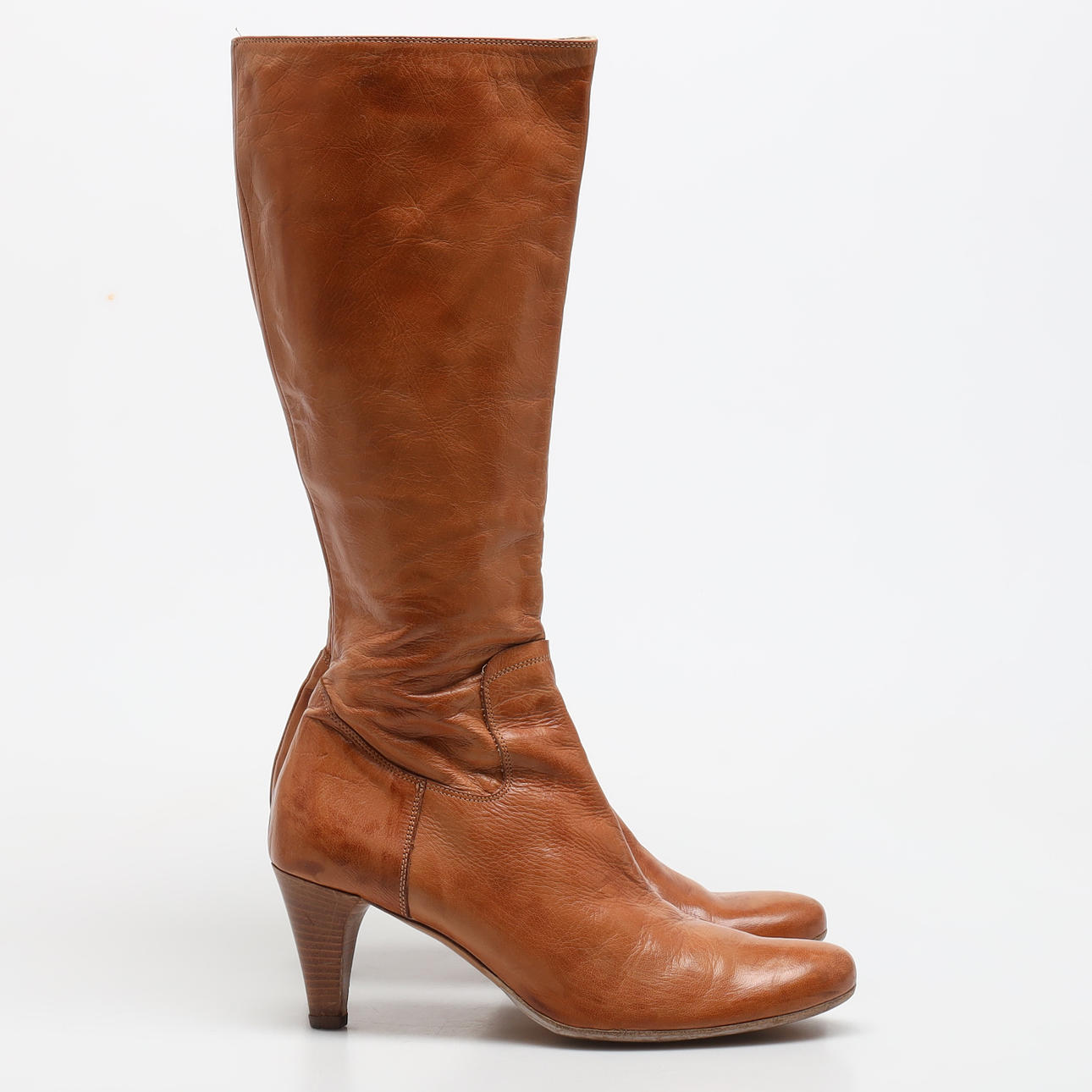 Brune læderstøvler med hæl, højde ca 7 cm, Skaftbredde ca 34,5 cm.