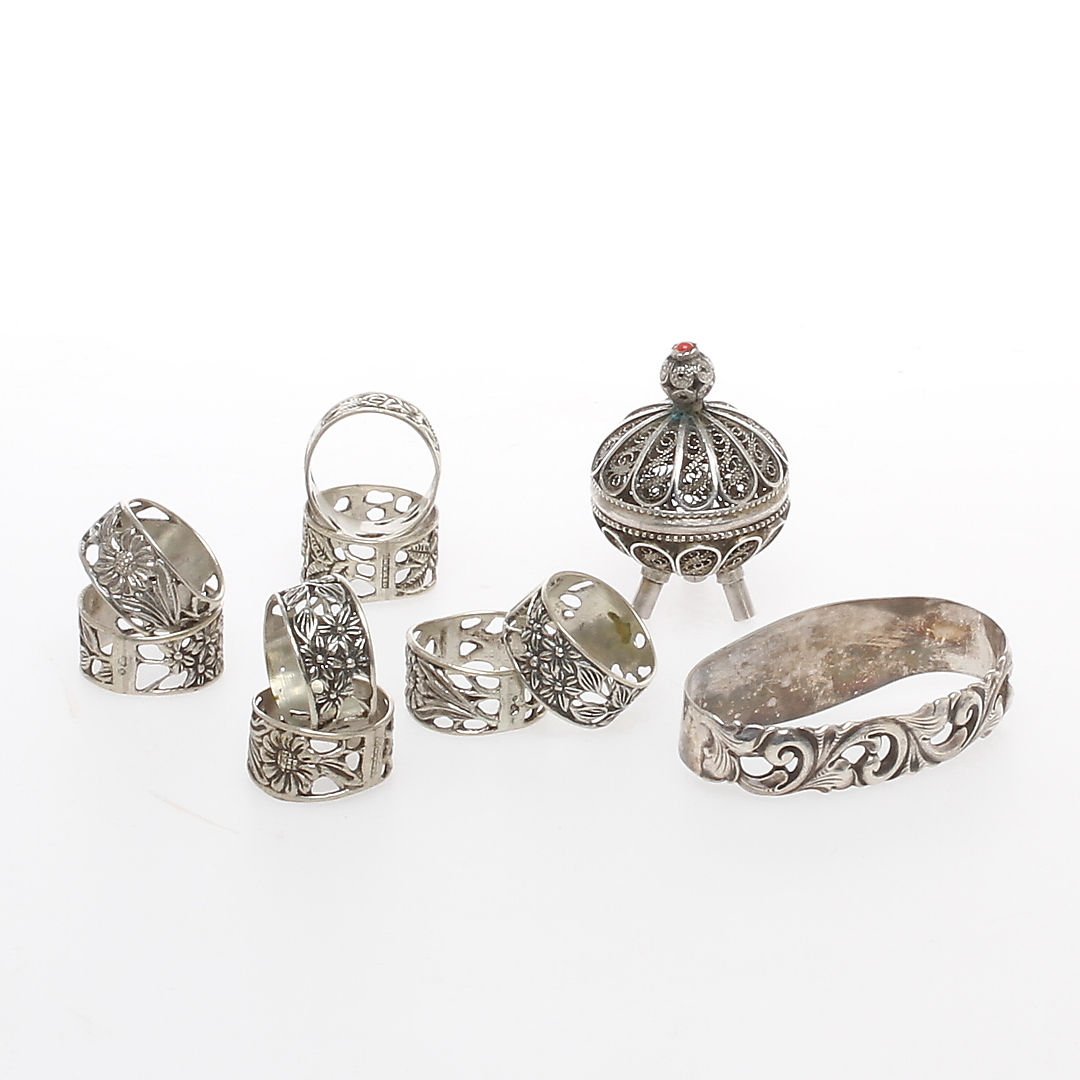 272252. SERIERRINGE 9 stk og DOSA, sølv, 1900-tallet.
