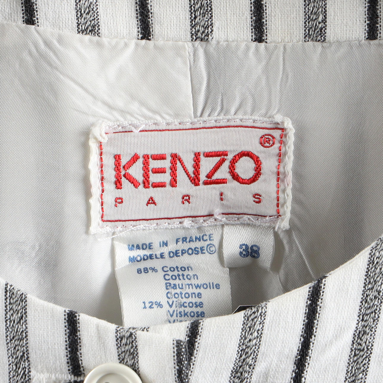 Kort jakke i stribet bomuldsstof, lukkes med knapper foran. To frontlommer. Indvendig foret, mærket Kenzo, Paris, str. 38. Ryglængde ca 52 cm, brystvidde ca 90 cm.