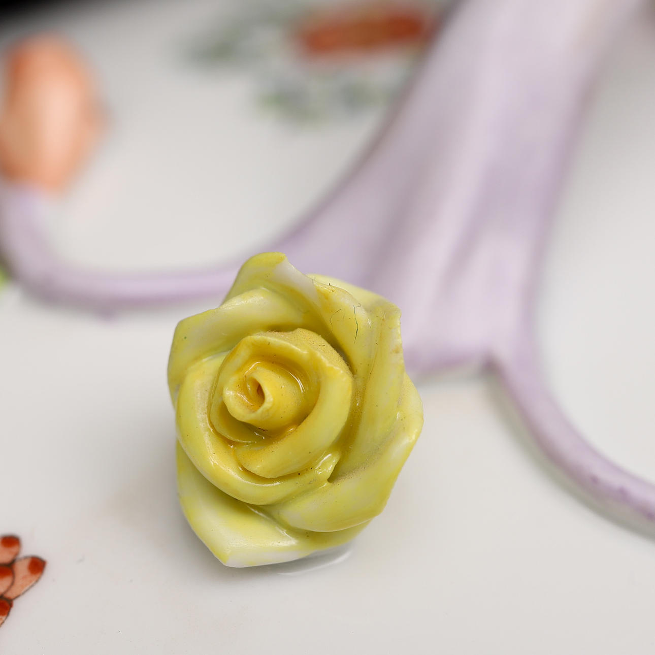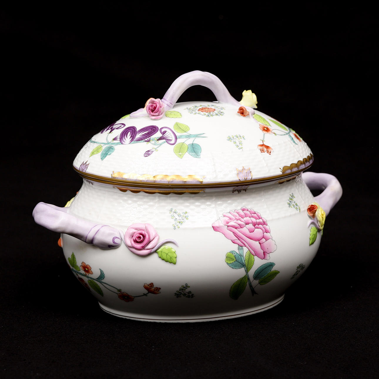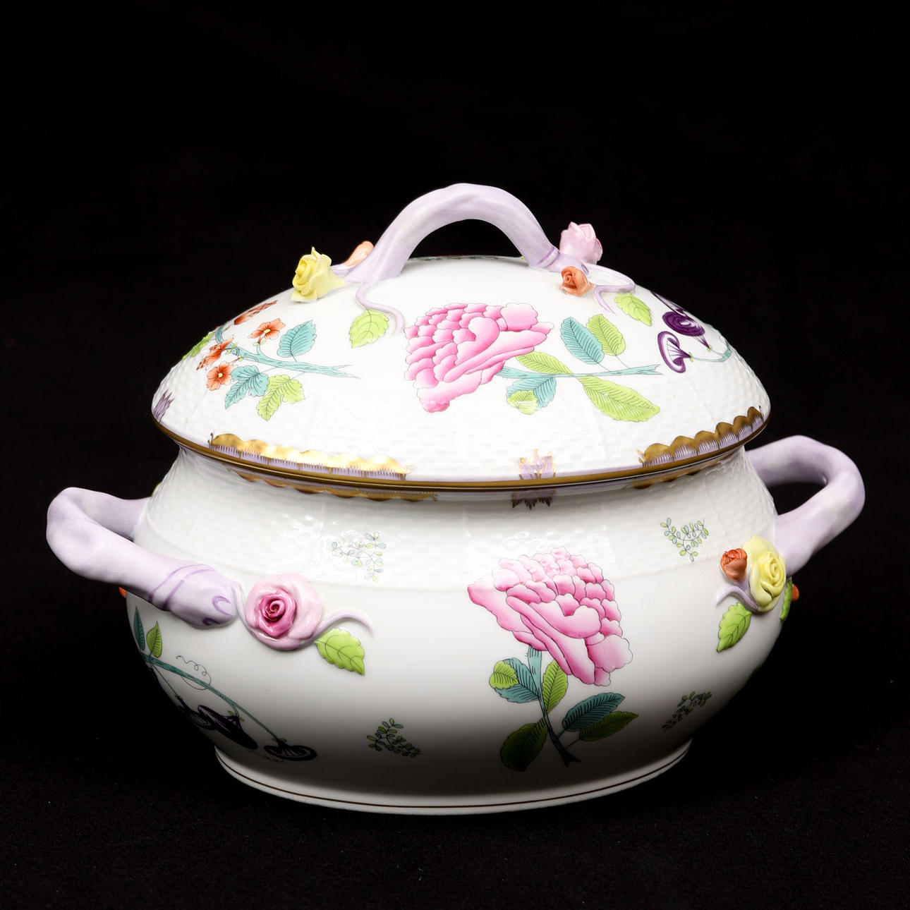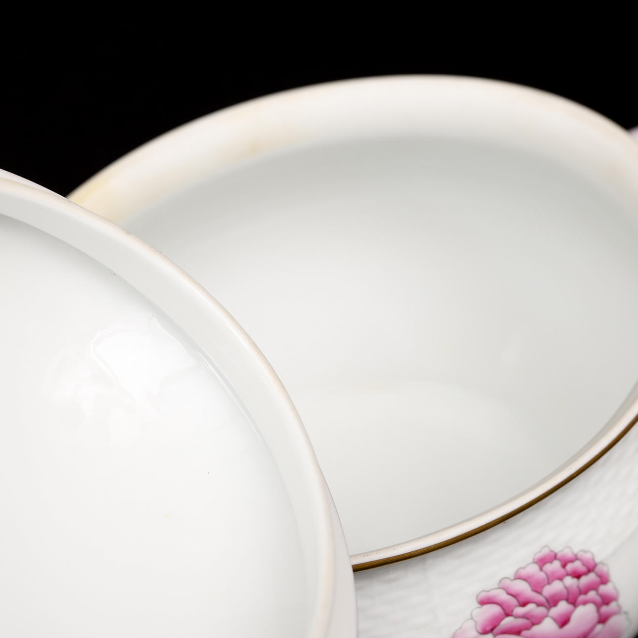 Uvæsentligt Brugsslitage. Låg på den større terrine med et minimalt Kantstødt på en blomst.