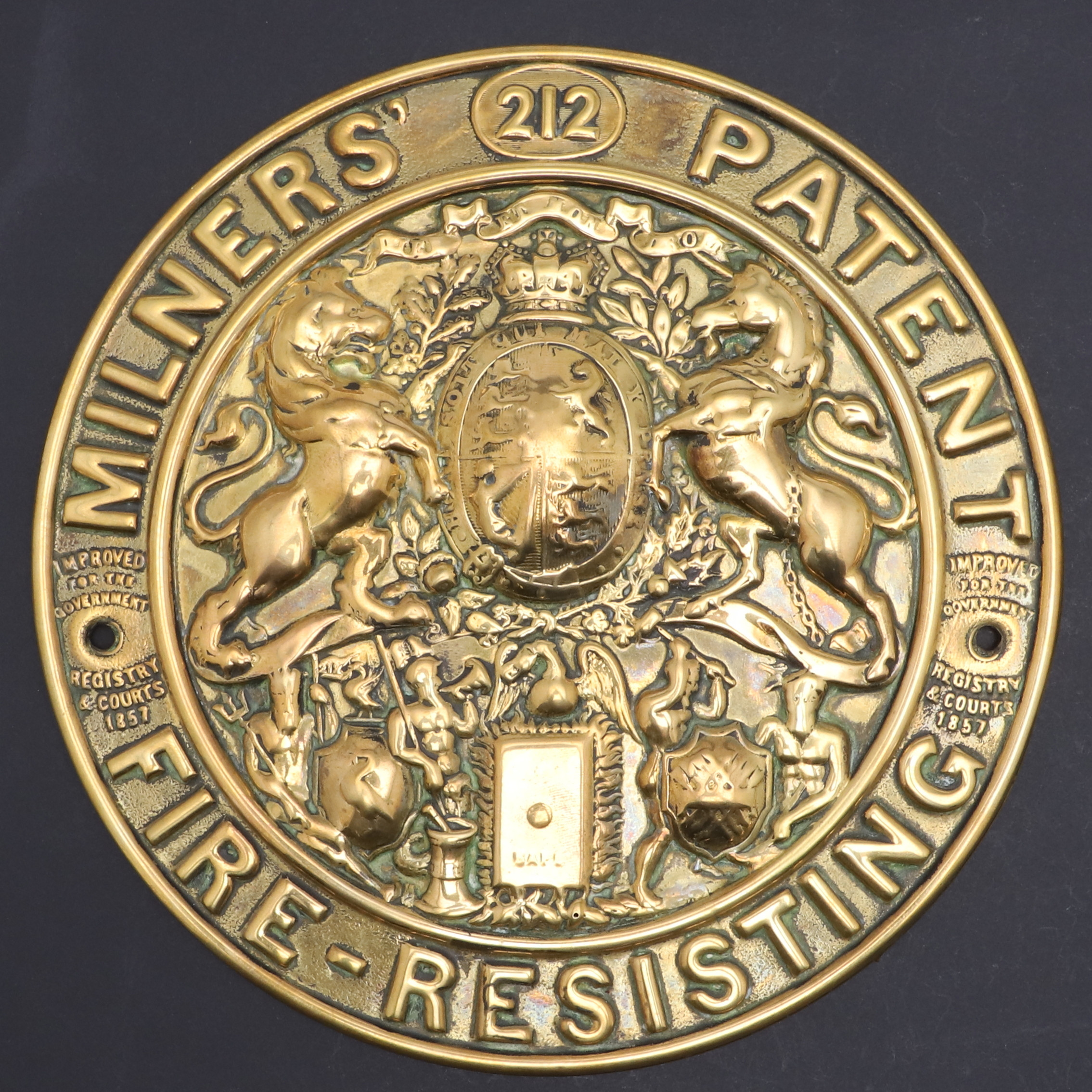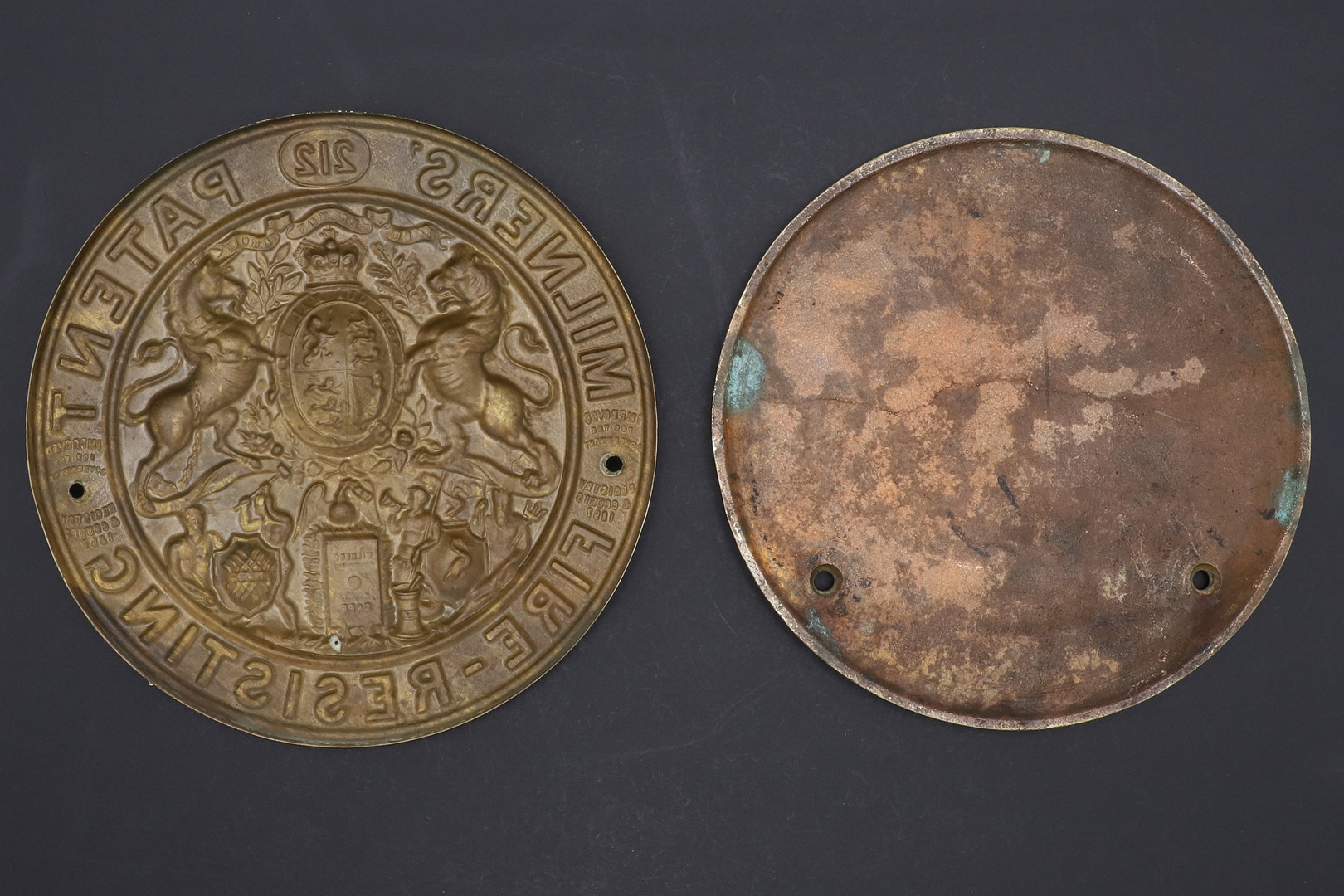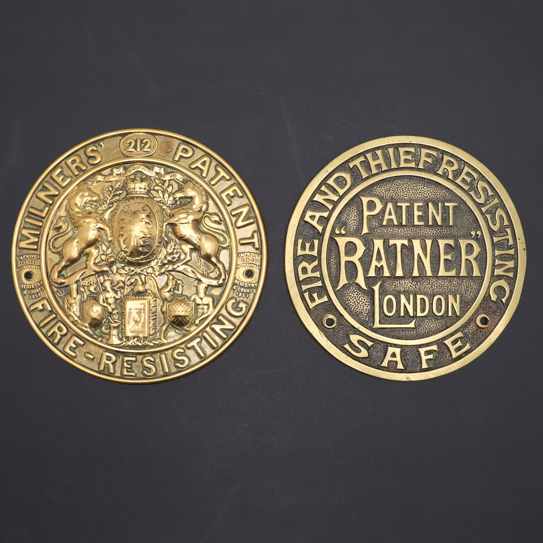 2731378. TO 19. ÅRHUNDREDE MESSING SIKKERE PLAQUES.