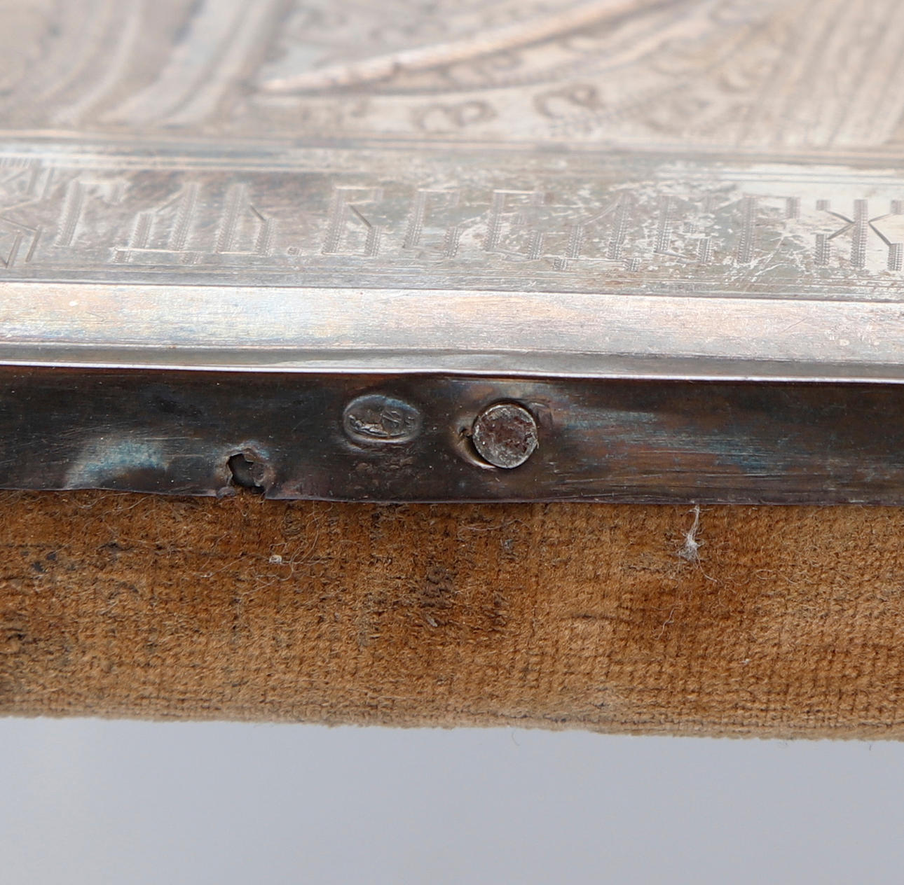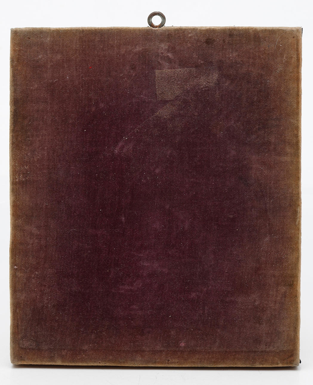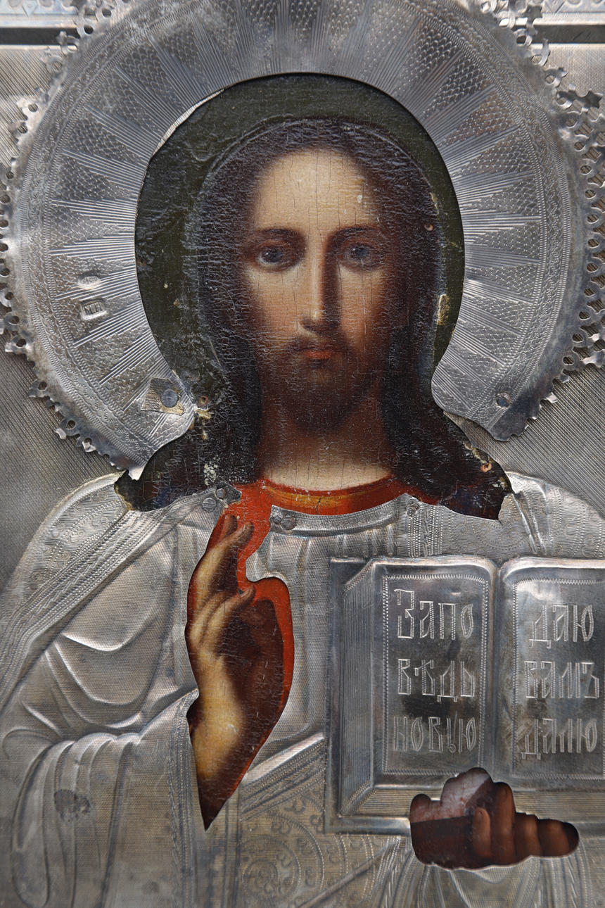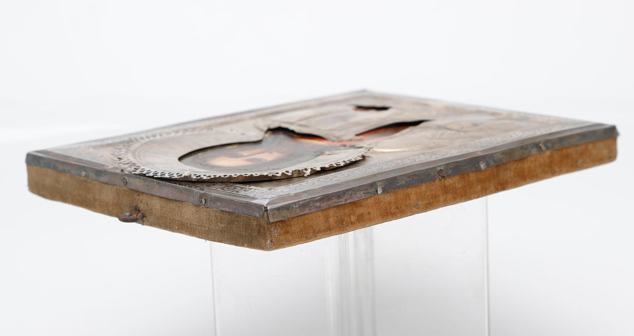 Ikon i olie på panel Riza i sølv fra Moskva (1899-1908) med assayer Ivan Lebedkins mærke og uidentificeret sølvsmedemærke Bagsiden er dækket af lilla fløjl 22,5x18 cm.