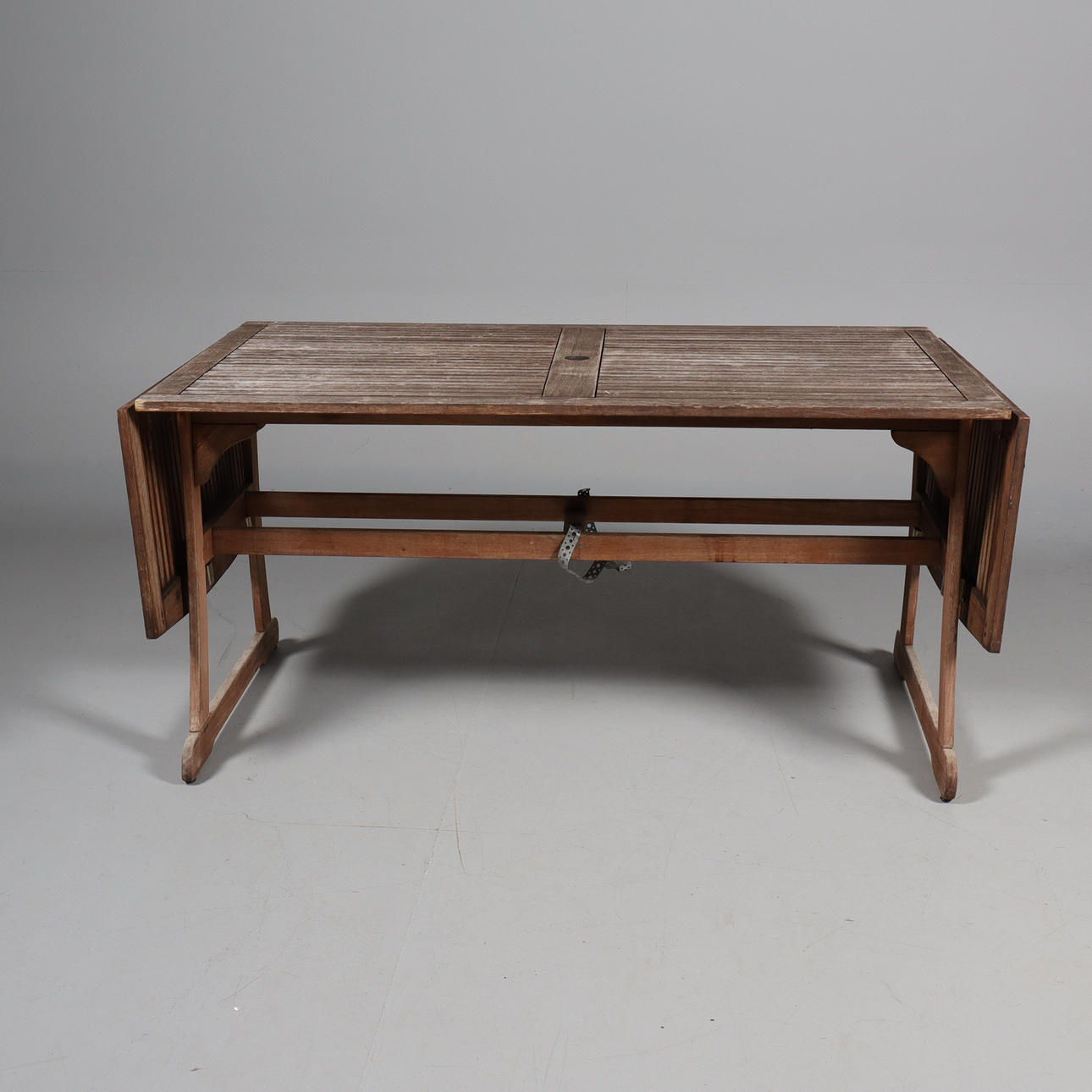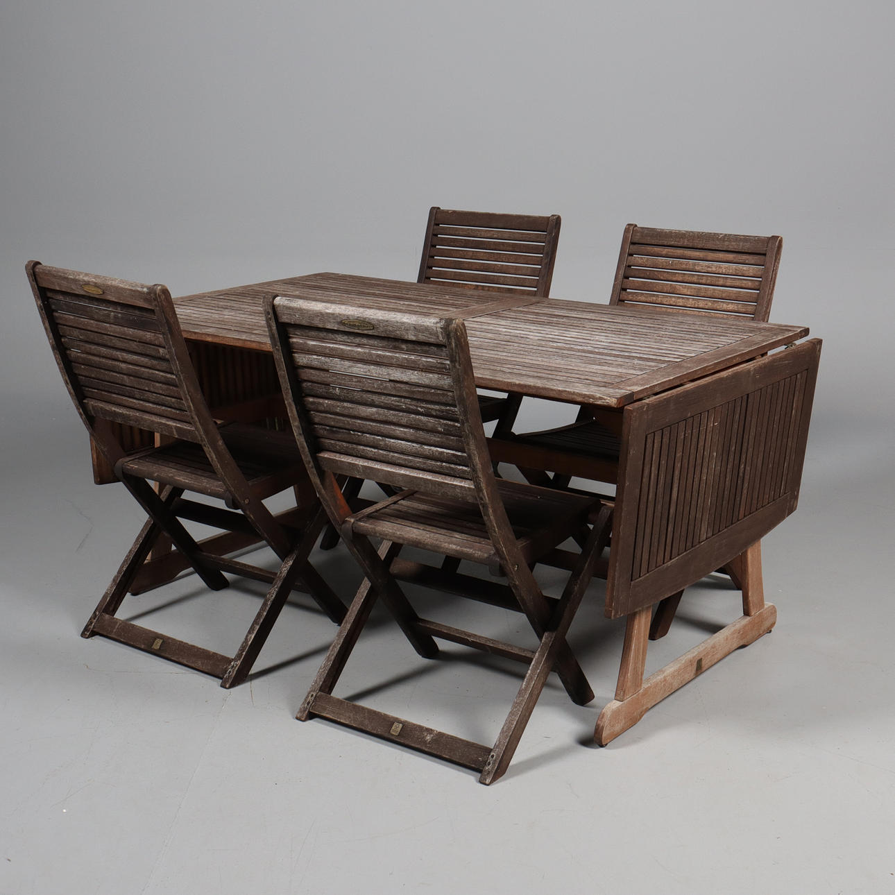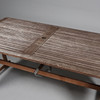 Bejdset teaktræ. Bord med 2 klapper. Højde 75 cm, længde 150 - 240 cm, bredde 90 cm.