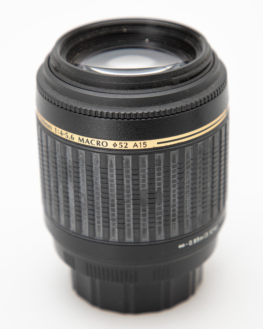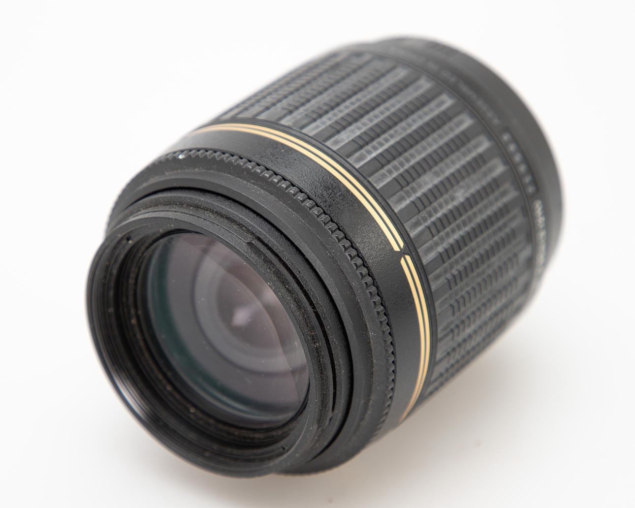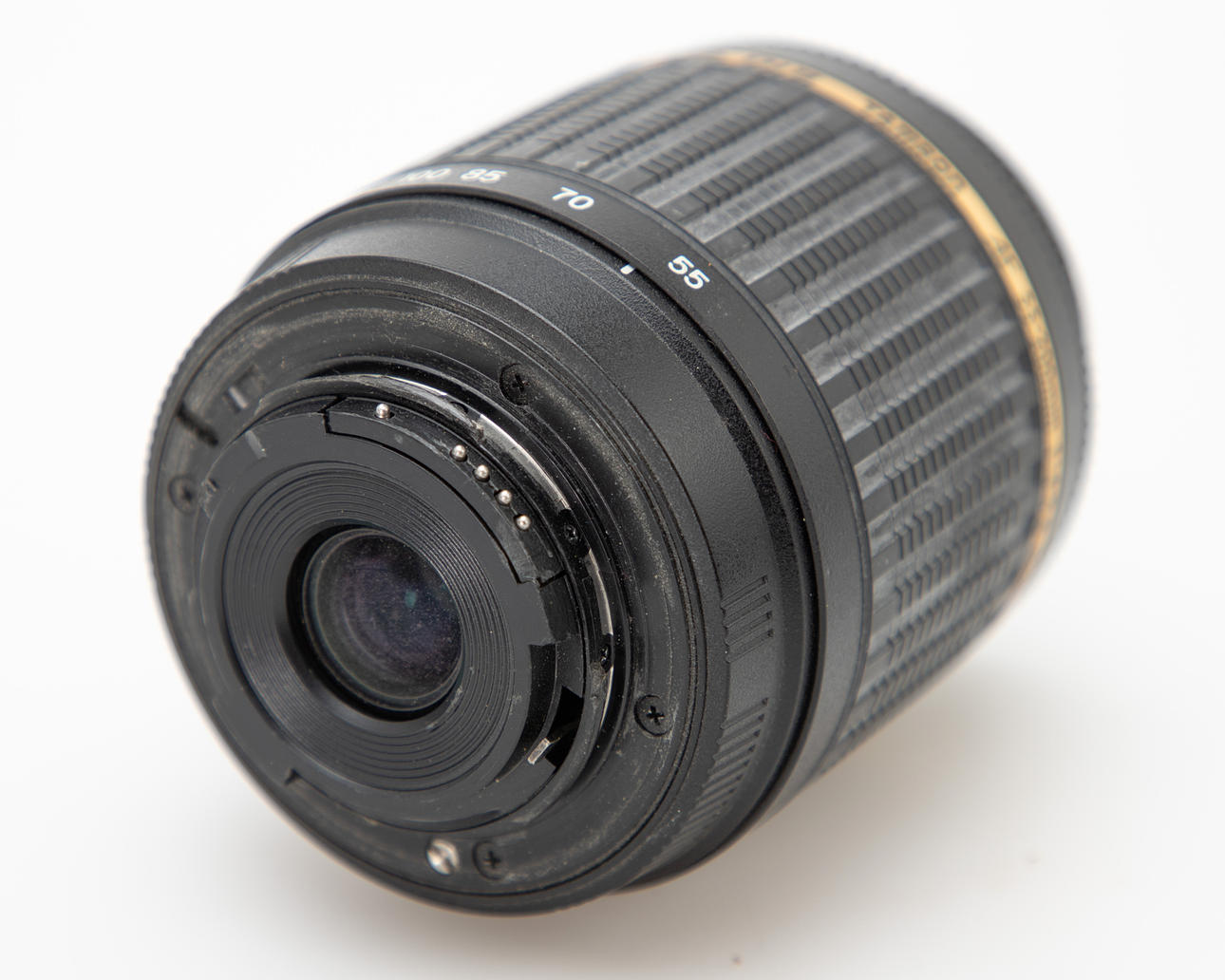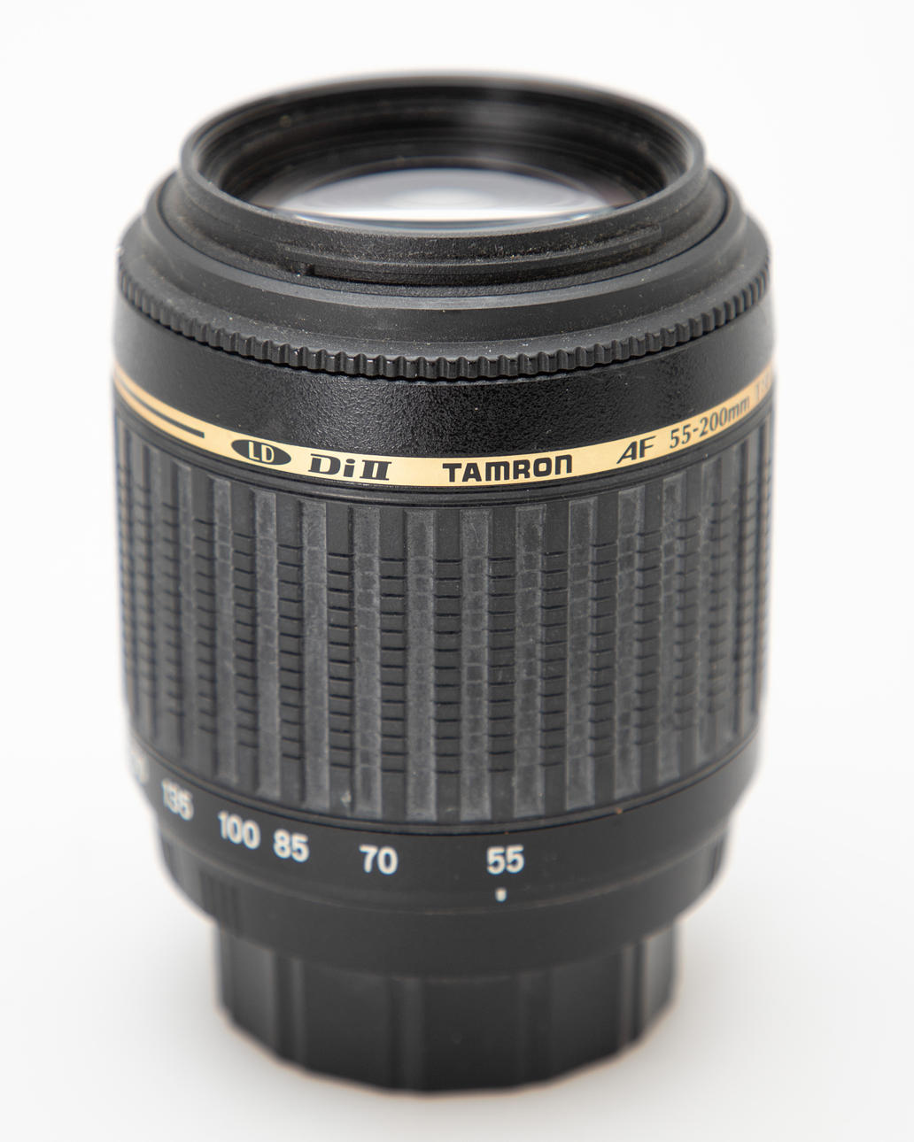 Tamron AF 55-200mm, objektivet er i brugt stand. Zoomringens gummi er falmet, der er støv i objektivet.