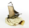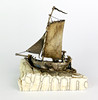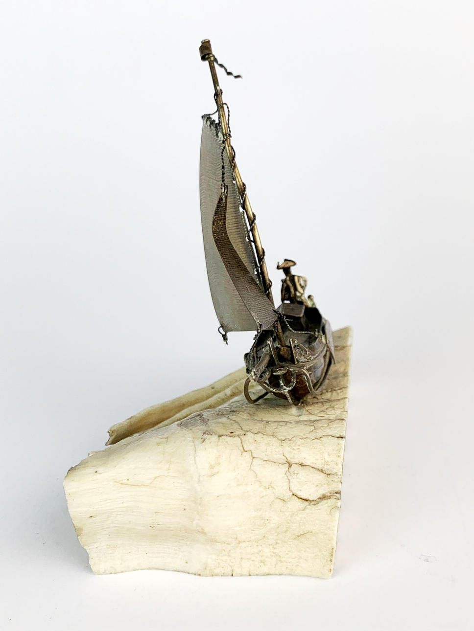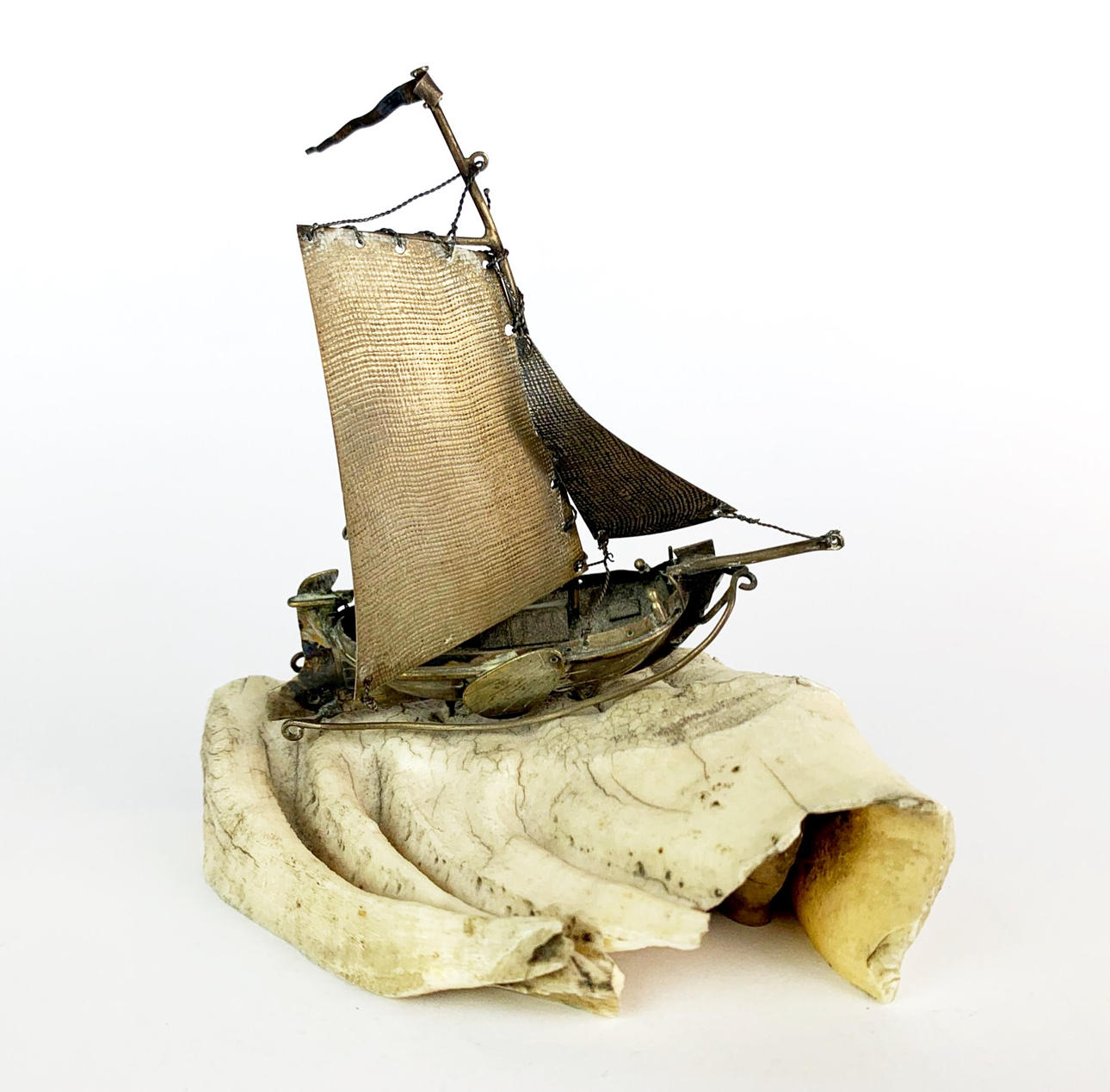 Et antikt håndlavet sejlfartøj i hvidt metal monteret på en sektion af forstenet kæbeknogle, B. 10cm H. 11cm.