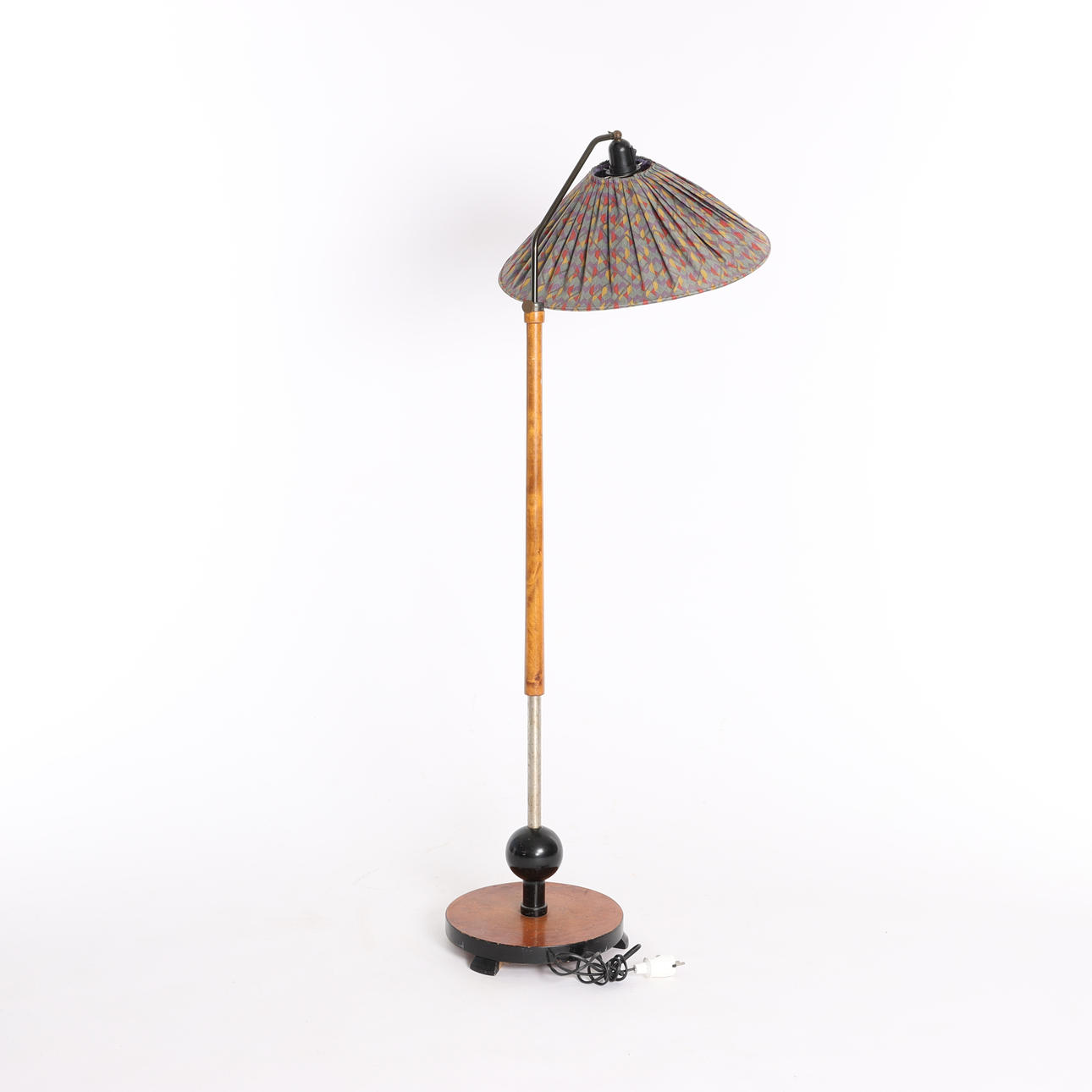 Gulvlampe, birk og metal, højdejusterbar, drejelig lyskilde, stofskærm. Art Deco, Sverige, 1930'erne.