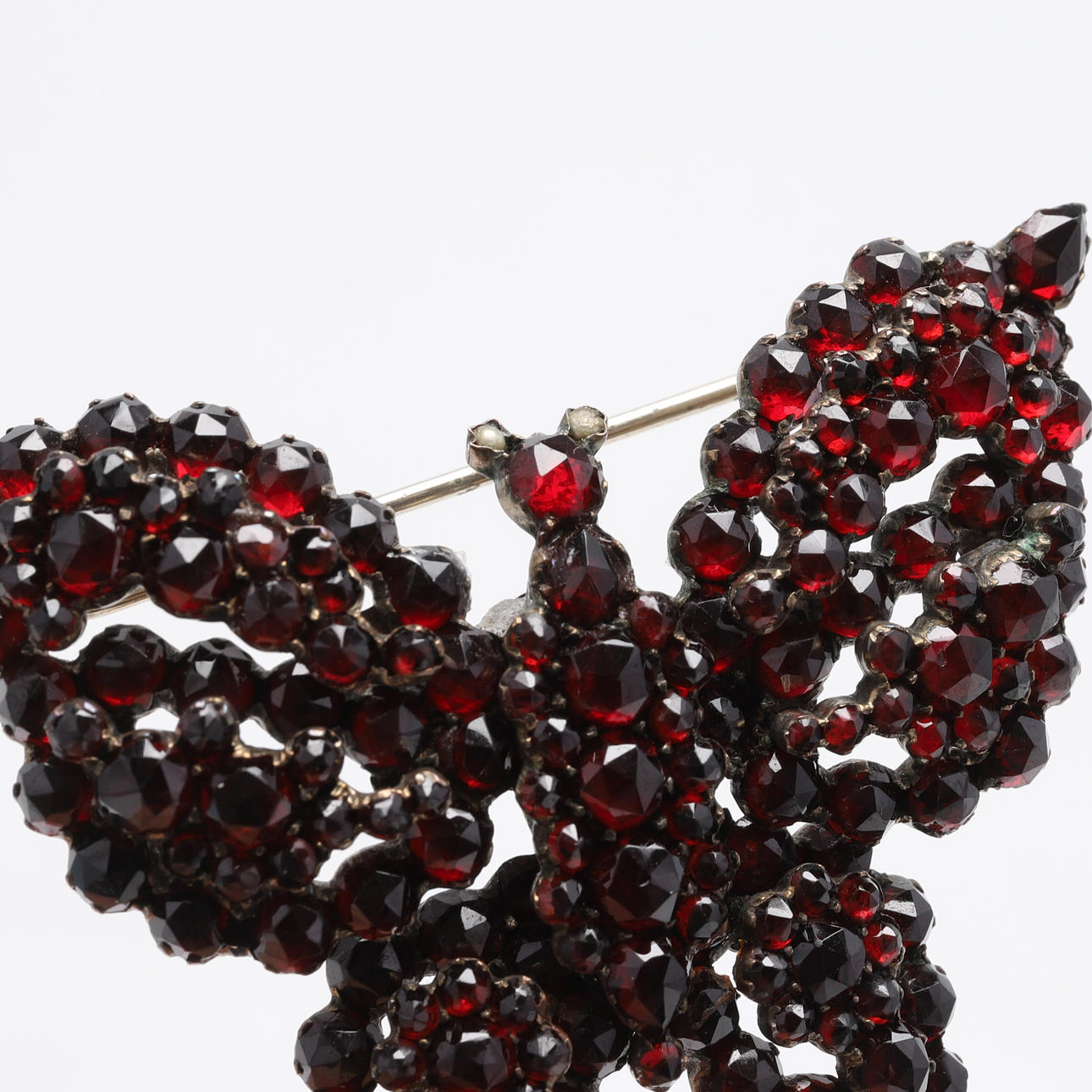 BROCHE/VÆNDE, granater, foran en sommerfugl.