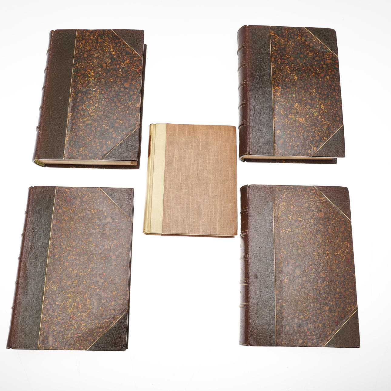 Spredte pletter, mørkfarvning til kanterne, typiske mærker og tegn på slid på omslagene.