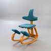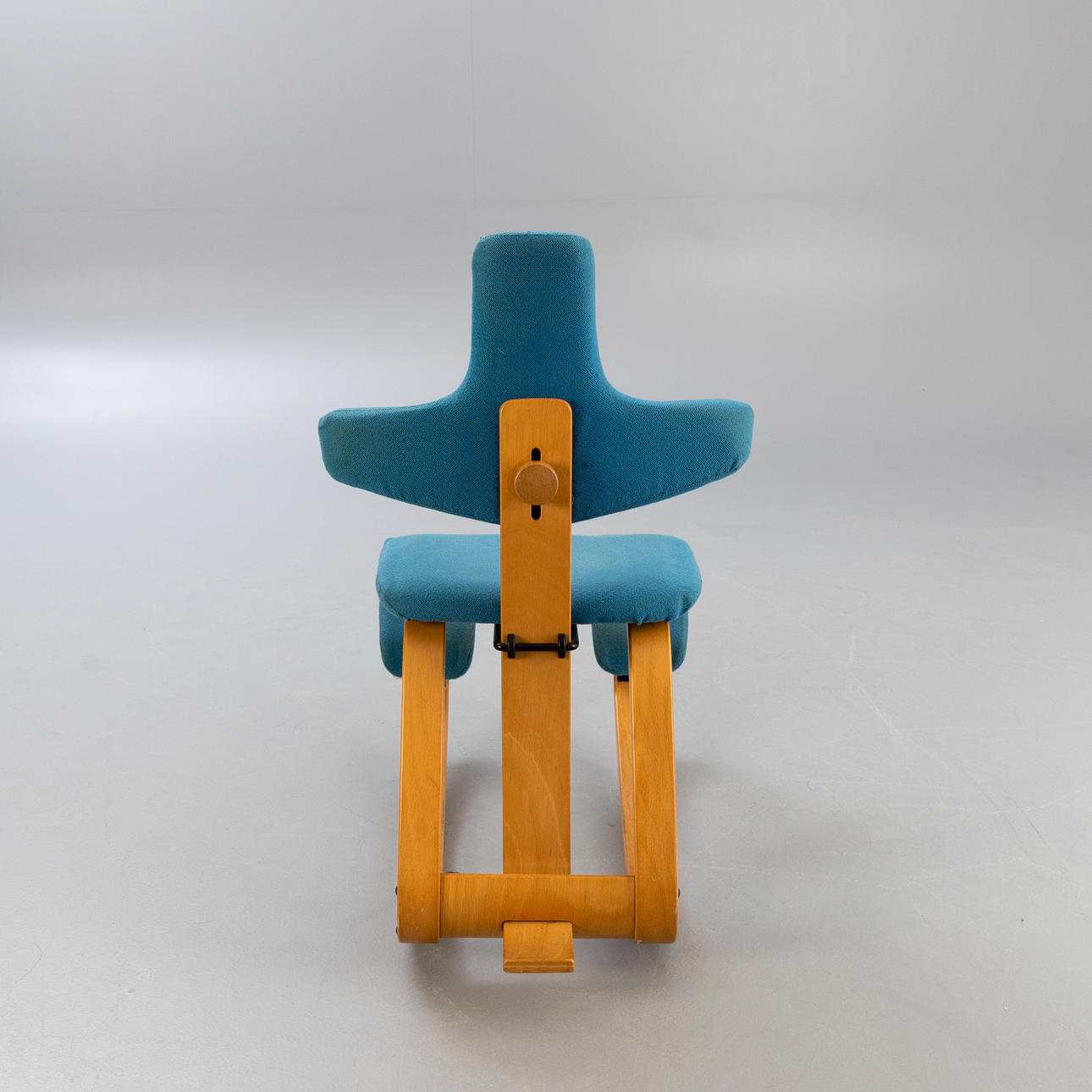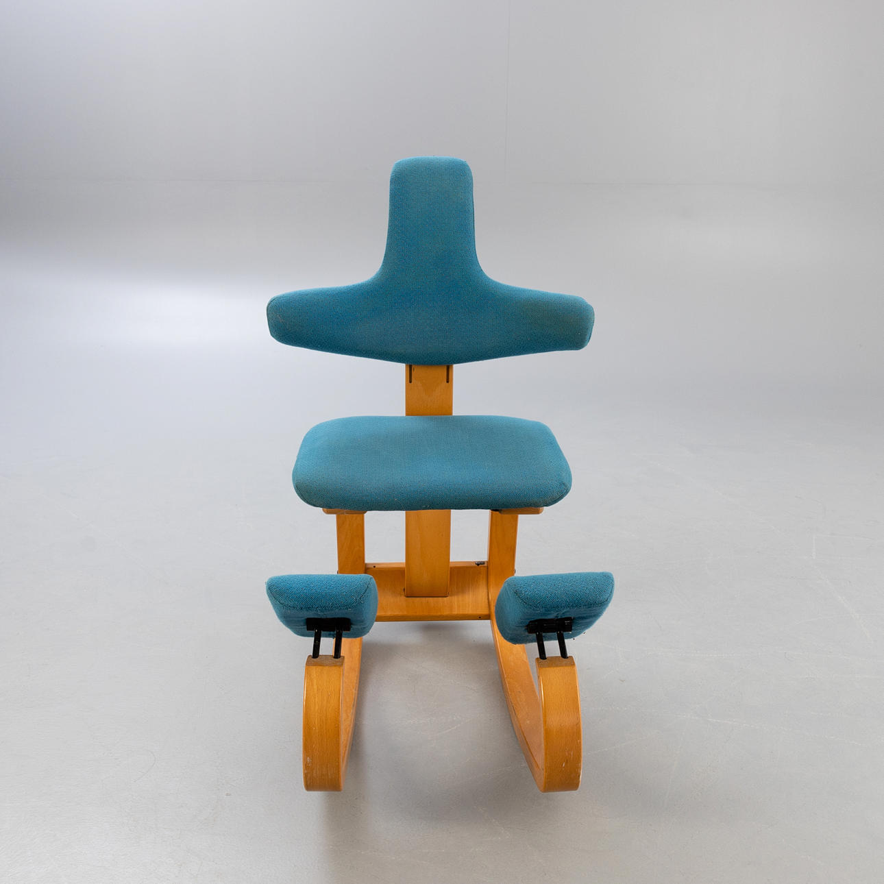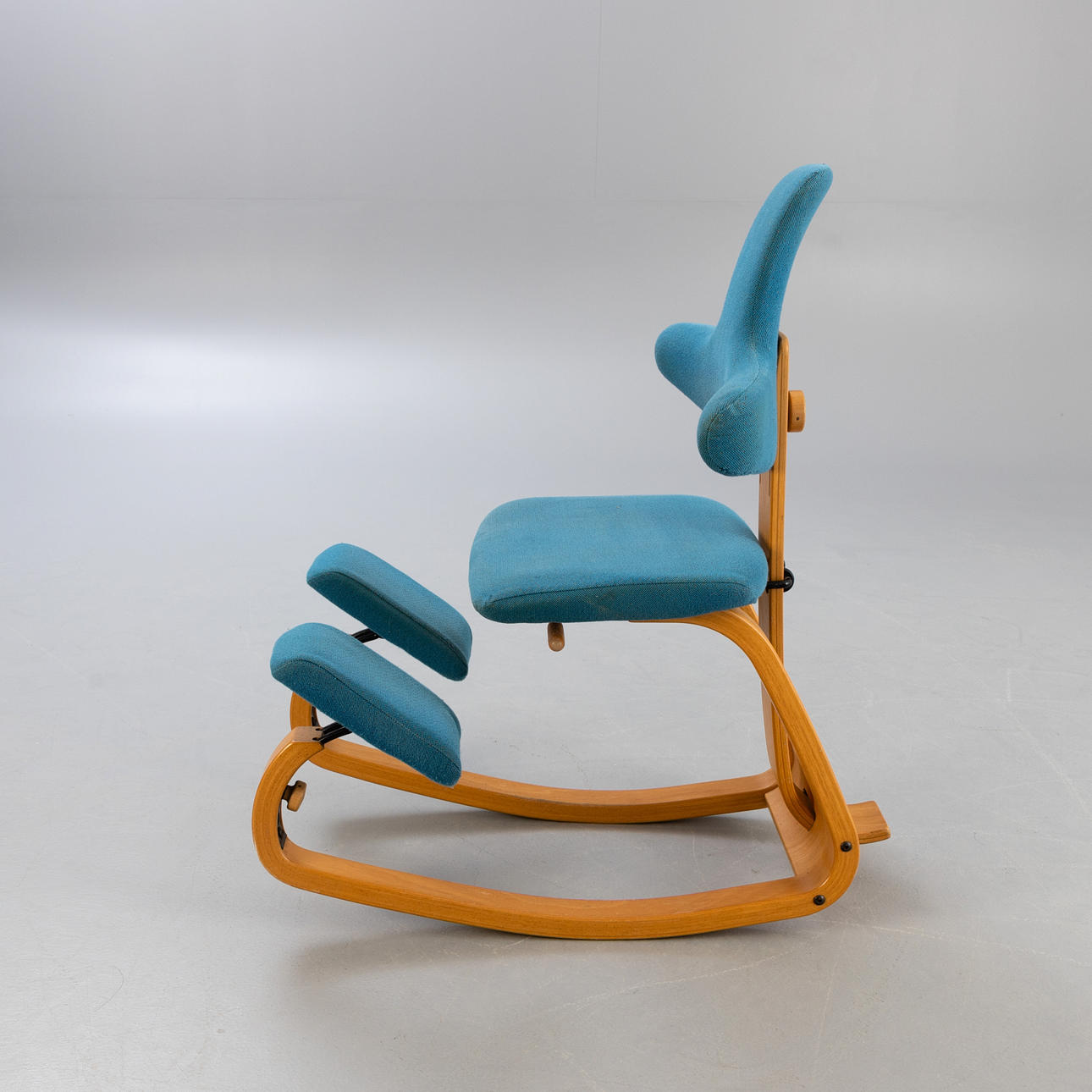 Relax lænestol fra Stokke, Norge. Lamineret krydsfinerkonstruktion. Sæde og ryg polstret og betrukket med stof. Ergonomisk stol med justerbart ryglæn.