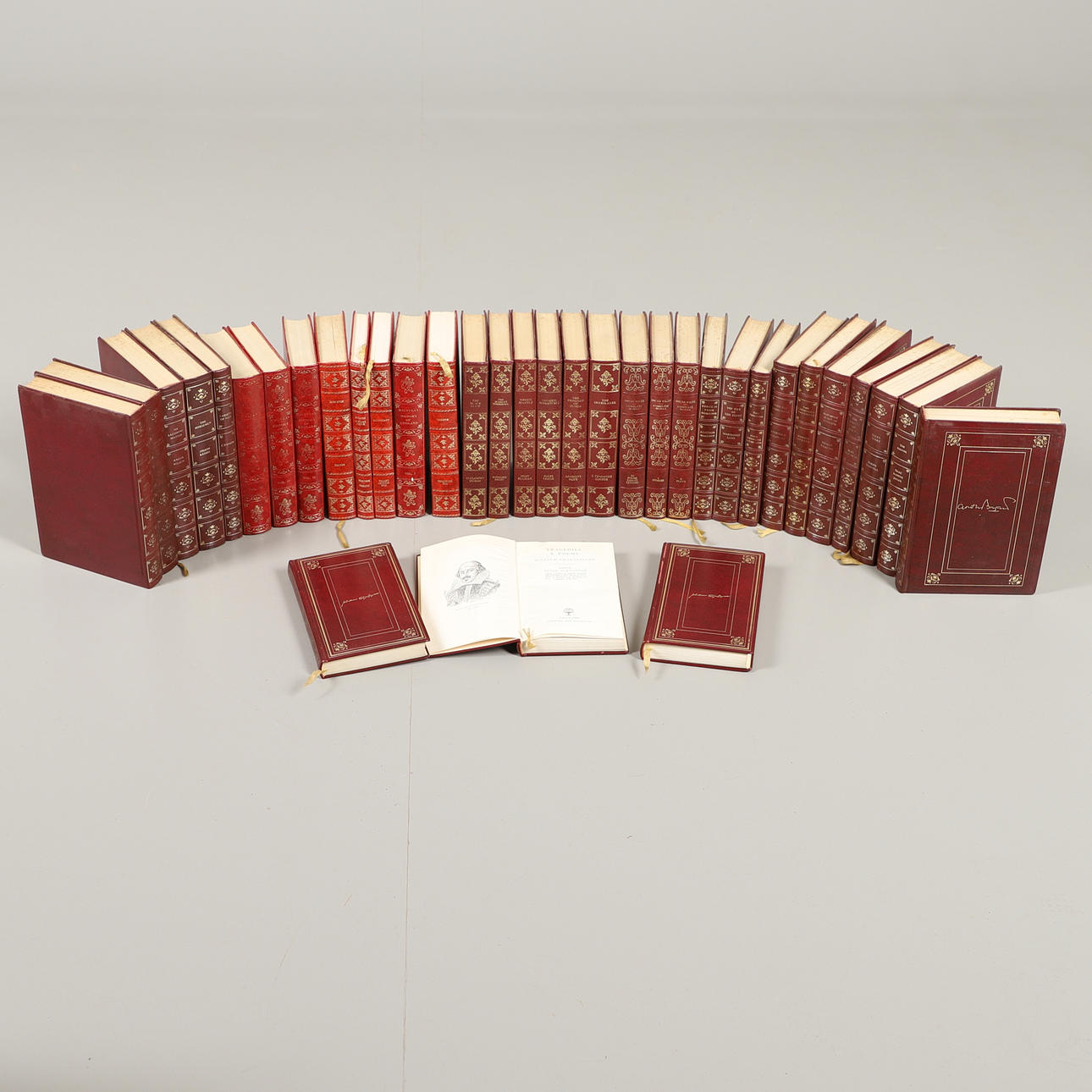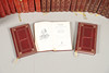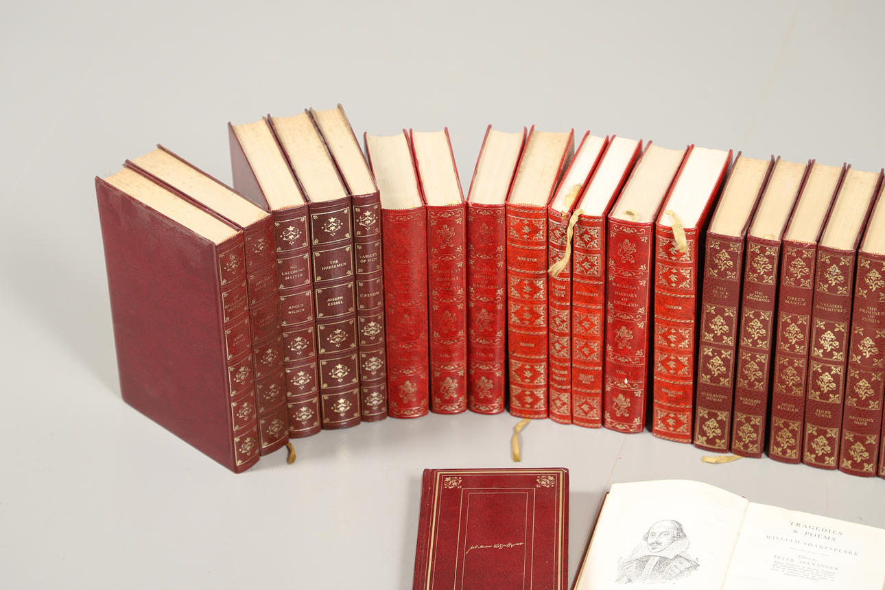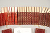 EN MÆNGDE RØDE LÆDERINDBUNDNE BØGER.