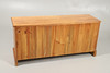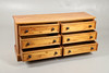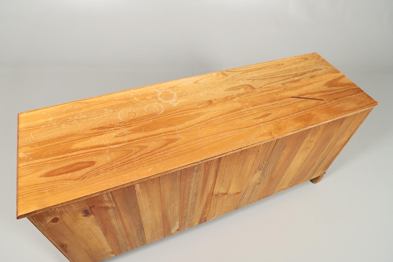 Med tre stablede skuffer i ens størrelse på hver side af hinanden, seks skuffer i alt. Højde 62cm x Længde 130cm x Dybde 40cm.