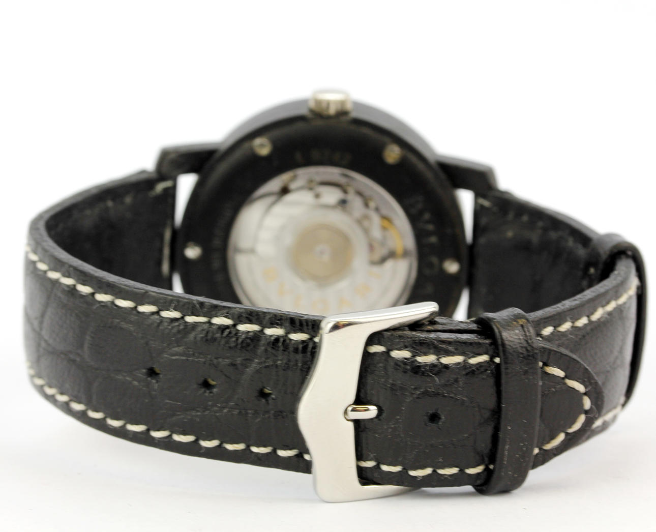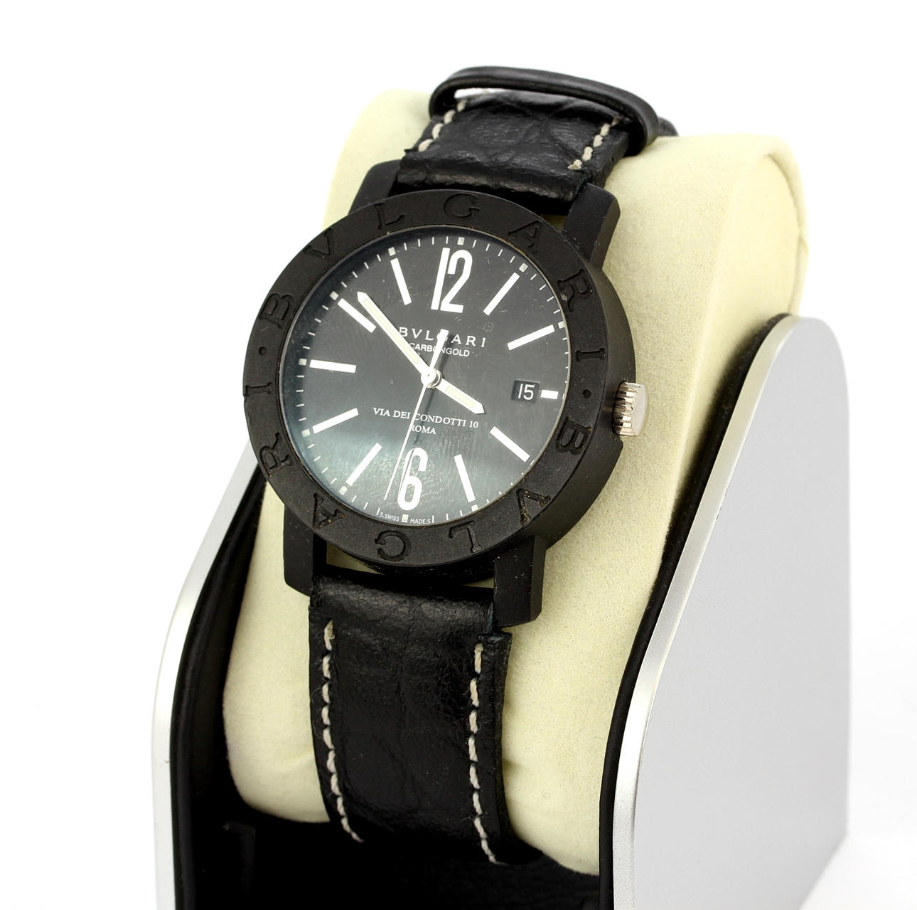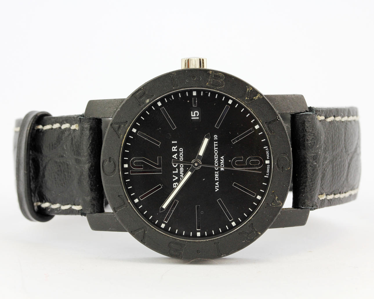 Et automatisk Bvlgari Carbongold 1884 armbåndsur (nr. L9742, BB 40 CL) på en sort læderrem, Urskive, 3,9 x 3,9 cm.