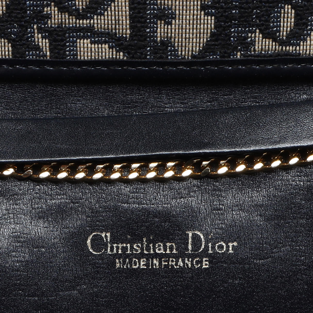 skulderremstaske / clutch i monogrammønstret vævet tekstillærred og detaljer i gult metal, 1980'erne. Mærket Christian Dior MADE IN FRANCE, mål ekskl. kæde, ca 12x19x3 cm.